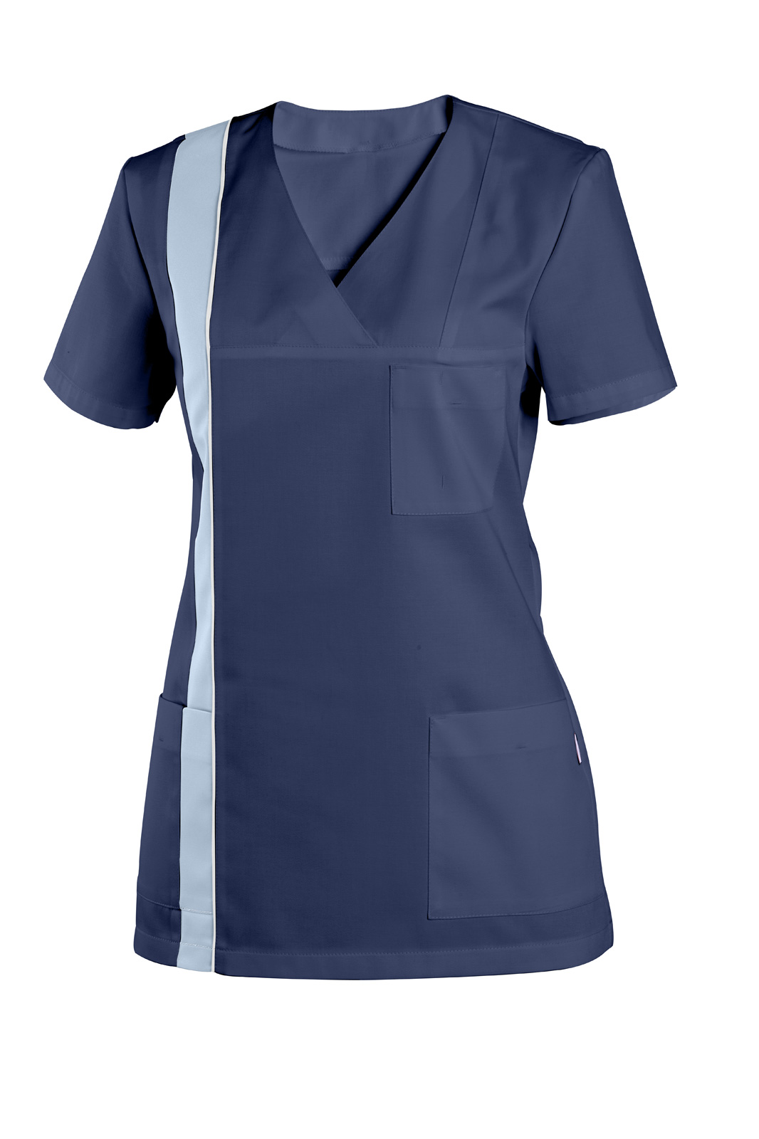 S krátkým rukávem, přeloženým sedlem do tvaru V. Na pravé straně barevný pruh s všitou dutinkou ukončený v sedle zadního dílu. Na předním díle našité dvě spodní a jedna náprsní kapsa.