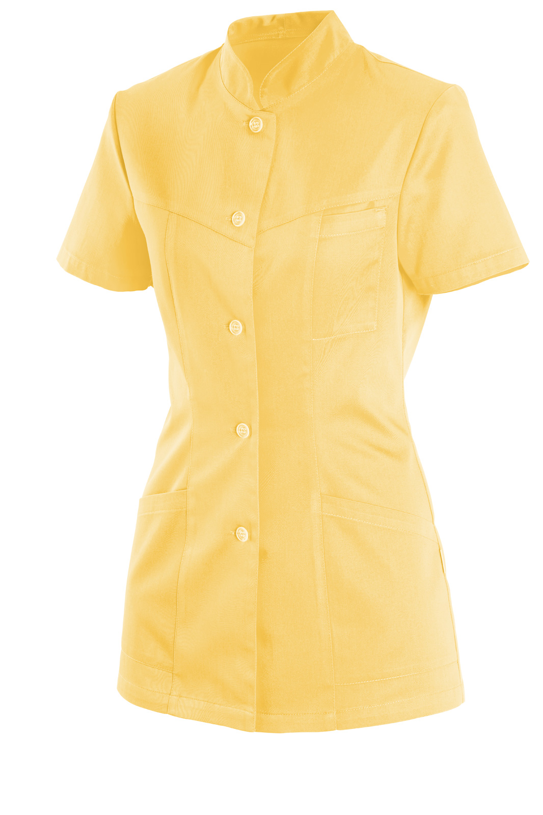 Princesového střihu se stojáčkem a krátkým rukávem. Celopropínací s předním i zadním sedlem. Na předním díle našité tři kapsy.