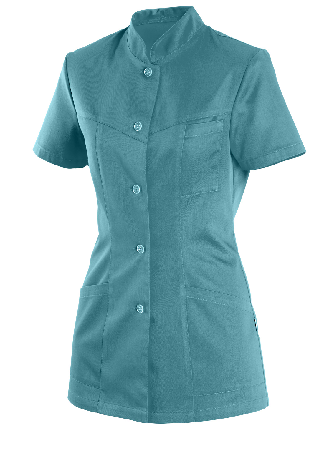 Princesového střihu se stojáčkem a krátkým rukávem. Celopropínací s předním i zadním sedlem. Na předním díle našité tři kapsy.