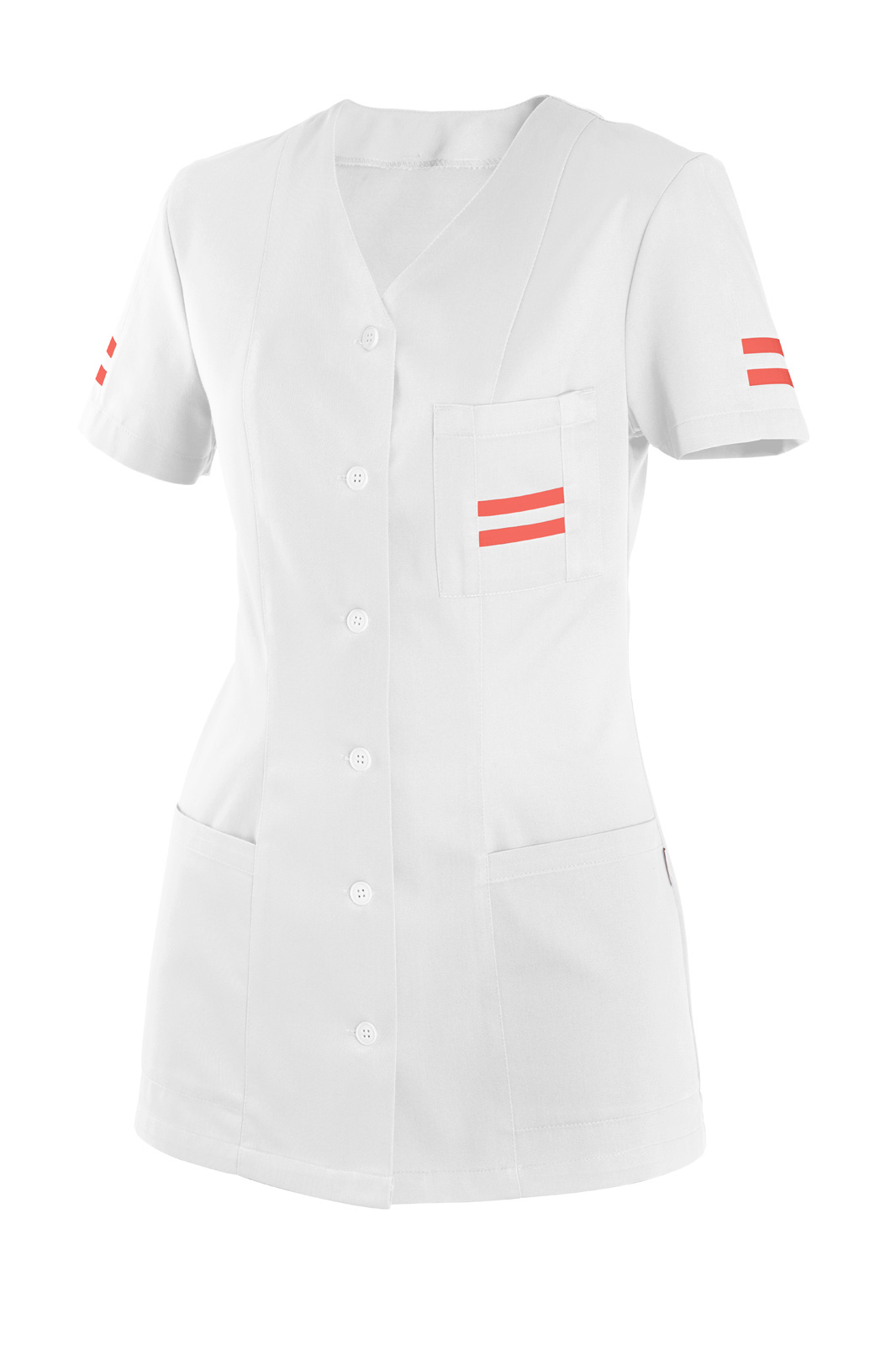 Princesového střihu s krátkým prostřiženým rukávem. Zapínání na knoflíky, výstřih do V a na předním díle tři našité kapsy. Rukáv a náprsní kapsa s barevnými lampasy.