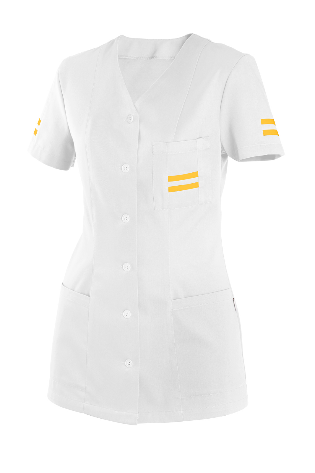Princesového střihu s krátkým prostřiženým rukávem. Zapínání na knoflíky, výstřih do V a na předním díle tři našité kapsy. Rukáv a náprsní kapsa s barevnými lampasy.