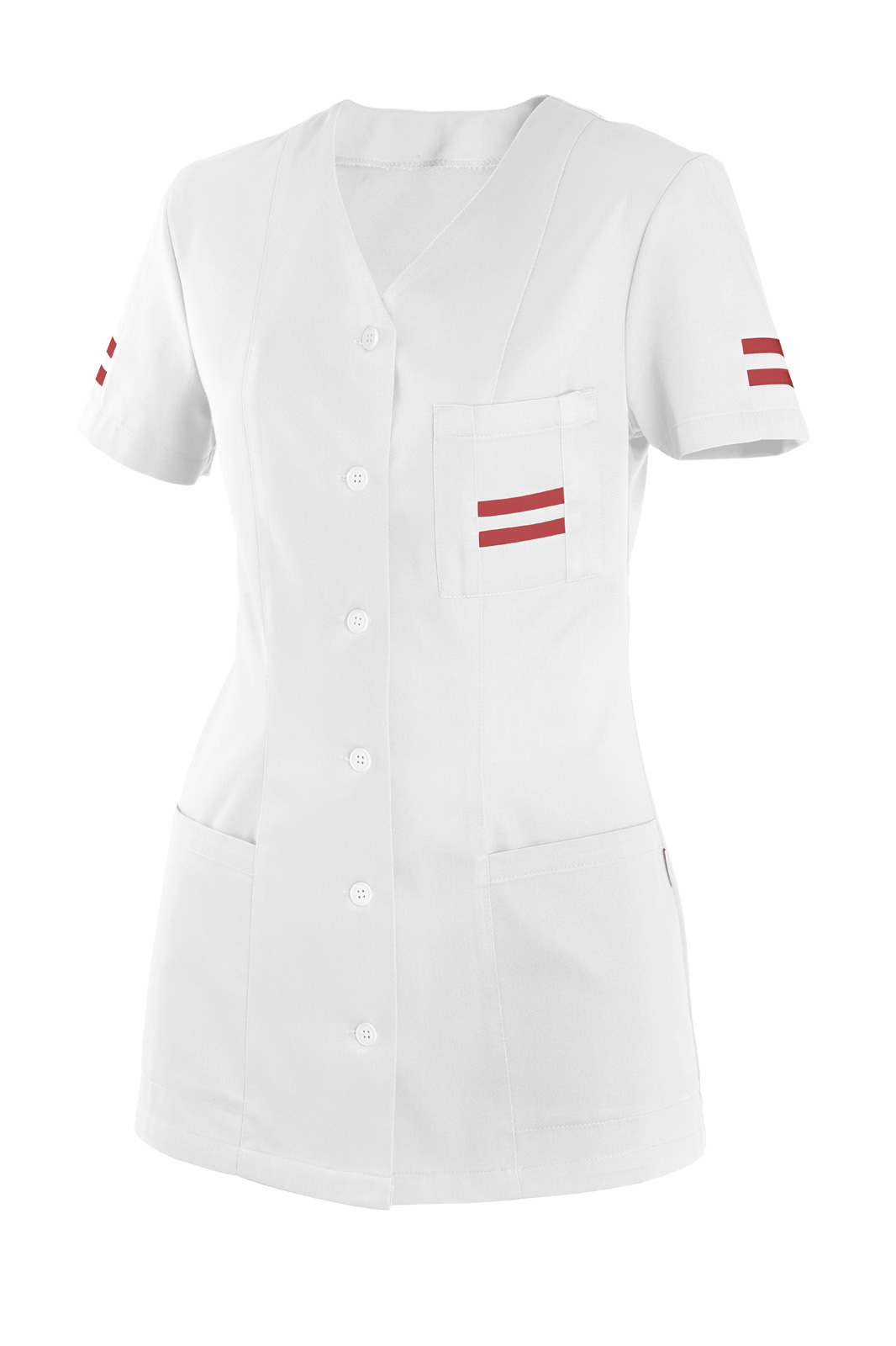 Princesového střihu s krátkým prostřiženým rukávem. Zapínání na knoflíky, výstřih do V a na předním díle tři našité kapsy. Rukáv a náprsní kapsa s barevnými lampasy.