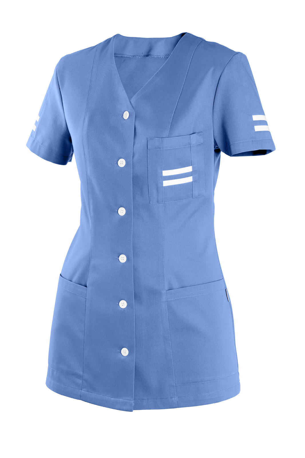 Princesového střihu s krátkým prostřiženým rukávem. Zapínání na knoflíky, výstřih do V a na předním díle tři našité kapsy. Rukáv a náprsní kapsa s bílými lampasy.