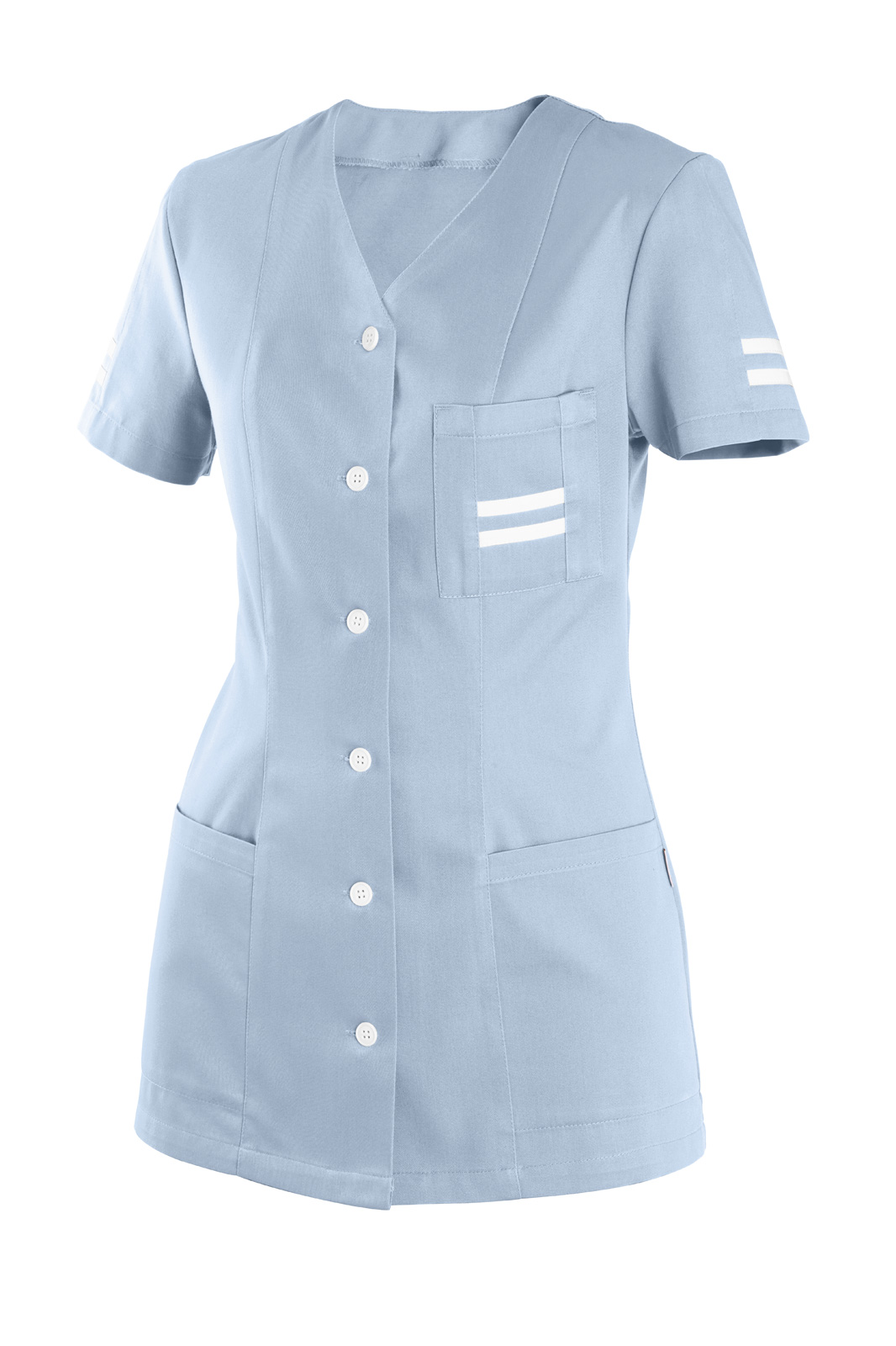 Princesového střihu s krátkým prostřiženým rukávem. Zapínání na knoflíky, výstřih do V a na předním díle tři našité kapsy. Rukáv a náprsní kapsa s bílými lampasy.