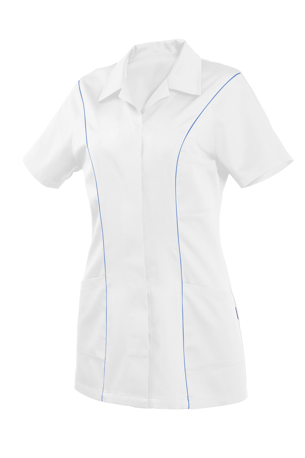 Princesového střihu s krátkým rukávem. Kryté zapínání na knoflíky, výstřih do rozhalenky. Na předním díle princes s všitou barevnou dutinkou a tři našité kapsy.