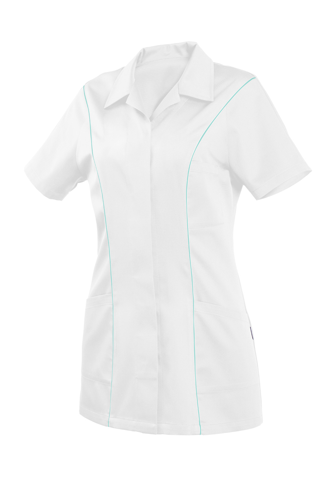 Princesového střihu s krátkým rukávem. Kryté zapínání na knoflíky, výstřih do rozhalenky. Na předním díle princes s všitou barevnou dutinkou a tři našité kapsy.