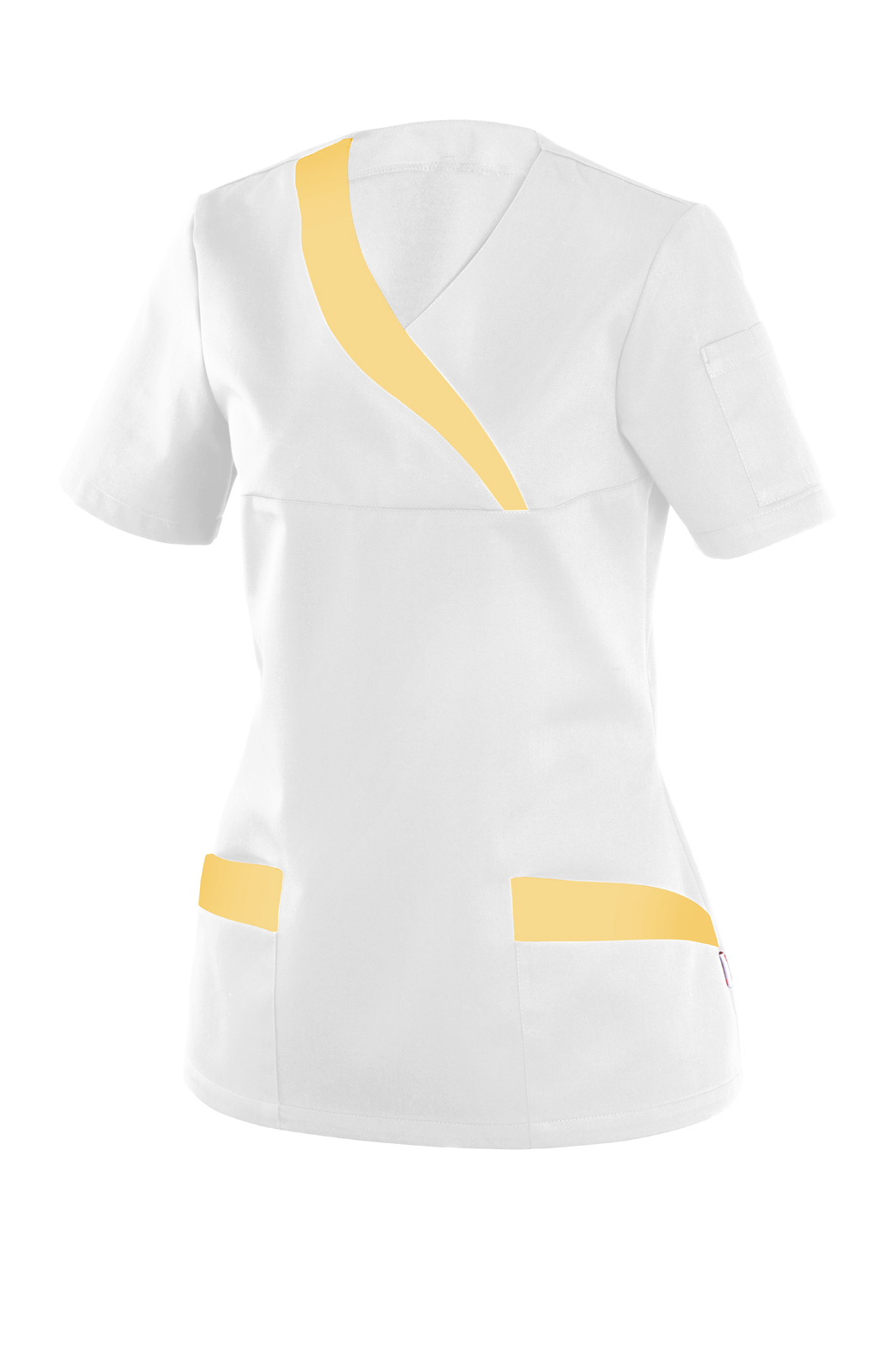 Volného střihu s krátkým rukávem a výstřihem do V s přeloženým barevným lemováním všitým do sedla. Na předním díle našité dvě spodní kapsy s barevným lemem a na levém rukávu malá kapsička.