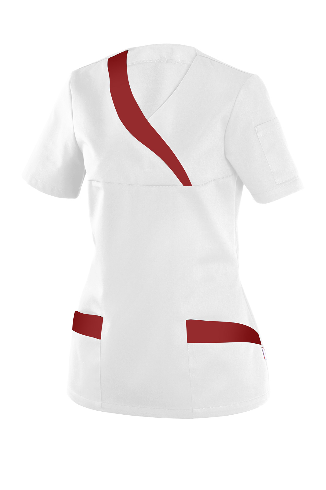 Volného střihu s krátkým rukávem a výstřihem do V s přeloženým barevným lemováním všitým do sedla. Na předním díle našité dvě spodní kapsy s barevným lemem a na levém rukávu malá kapsička.