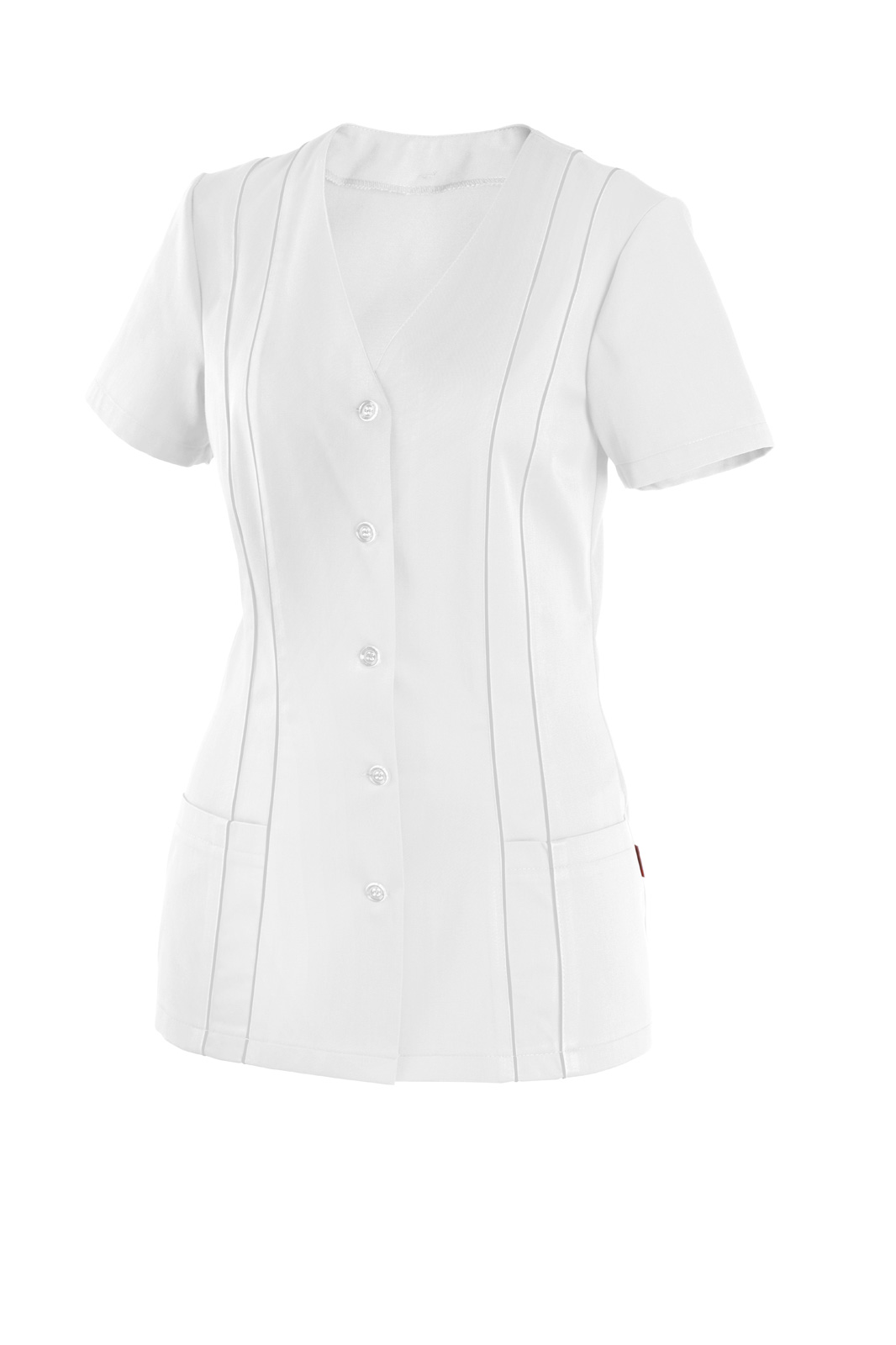 Princesového střihu, zapínání na knoflíky, výstřih do V. Krátký rukáv a na předním díle dvě našité kapsy. V prostřihu obou dílů vložený pruh s všitou dutinkou.