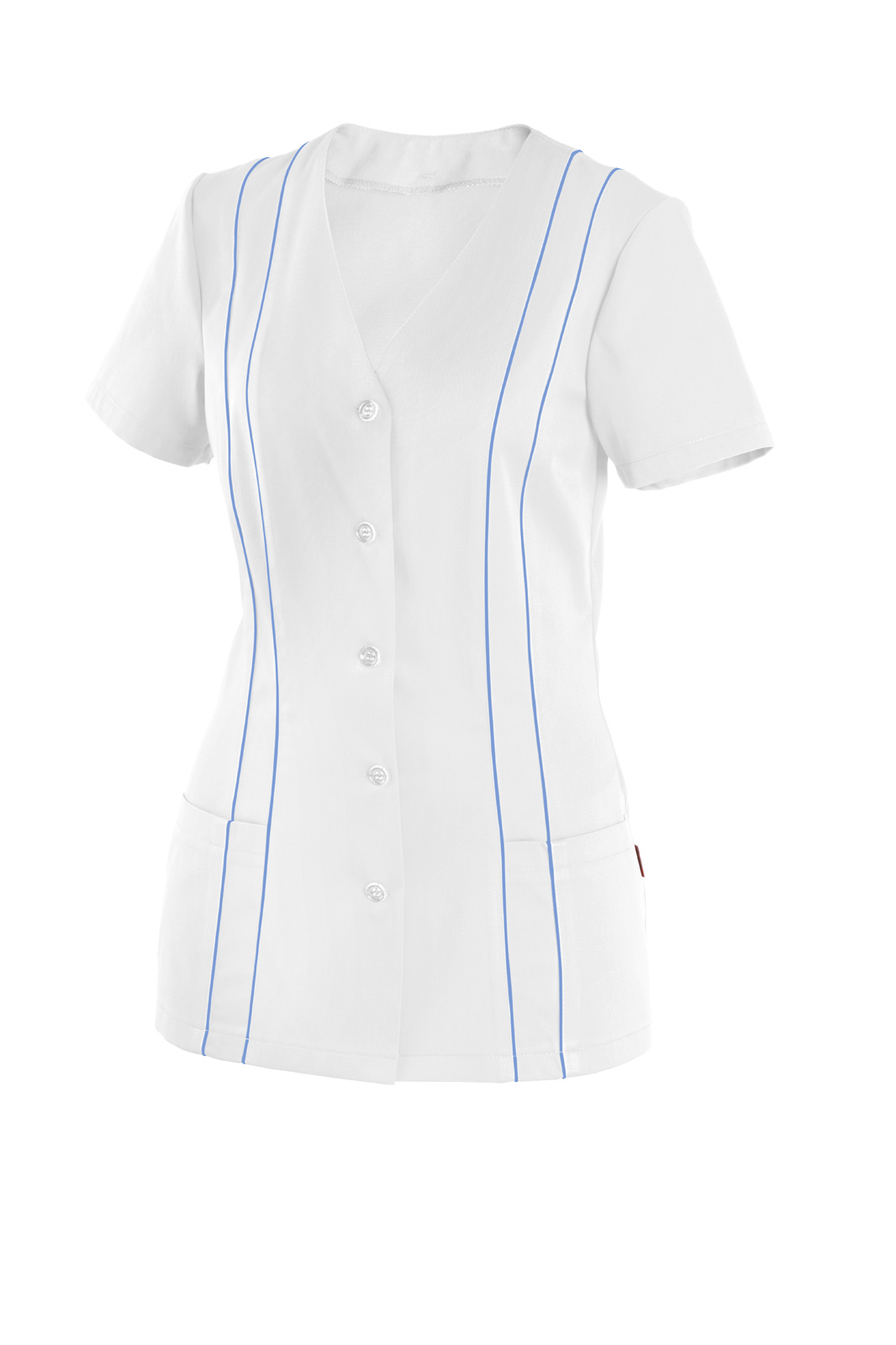 Princesového střihu, zapínání na knoflíky, výstřih do V. Krátký rukáv a na předním díle dvě našité kapsy. V prostřihu obou dílů vložený pruh s všitou dutinkou.