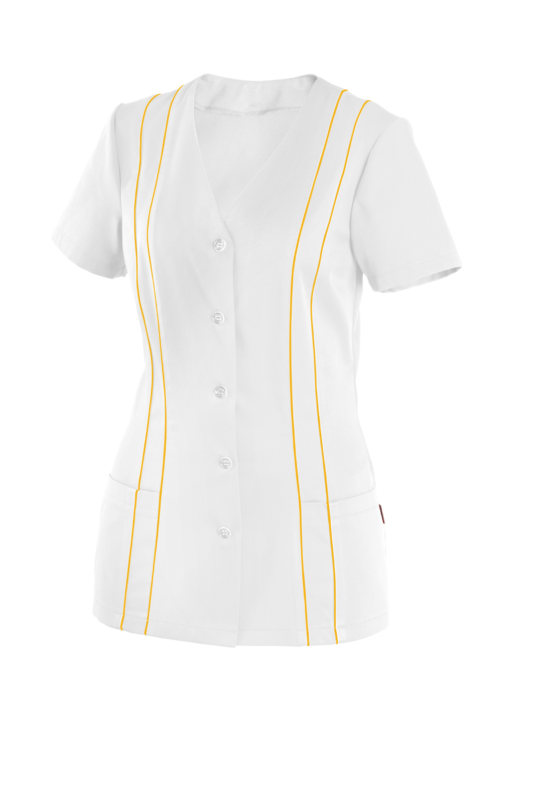 Princesového střihu, zapínání na knoflíky, výstřih do V. Krátký rukáv a na předním díle dvě našité kapsy. V prostřihu obou dílů vložený pruh s všitou dutinkou.