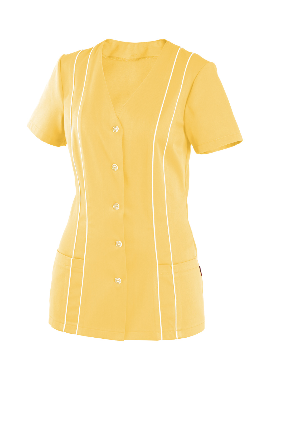 Princesového střihu, zapínání na knoflíky, výstřih do V. Krátký rukáv a na předním díle dvě našité kapsy. V prostřihu obou dílů vložený pruh s všitou dutinkou.