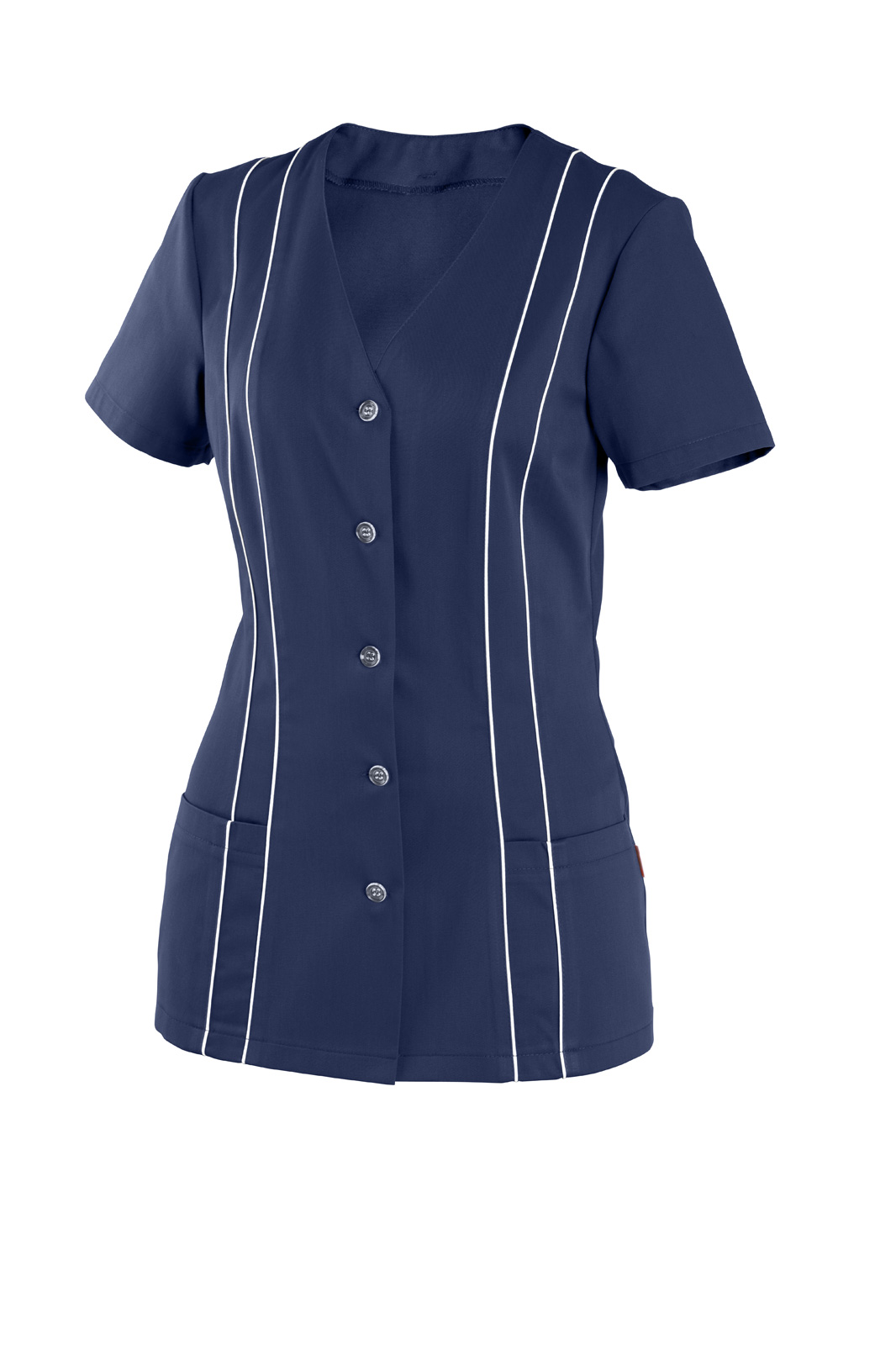 Princesového střihu, zapínání na knoflíky, výstřih do V. Krátký rukáv a na předním díle dvě našité kapsy. V prostřihu obou dílů vložený pruh s všitou dutinkou.