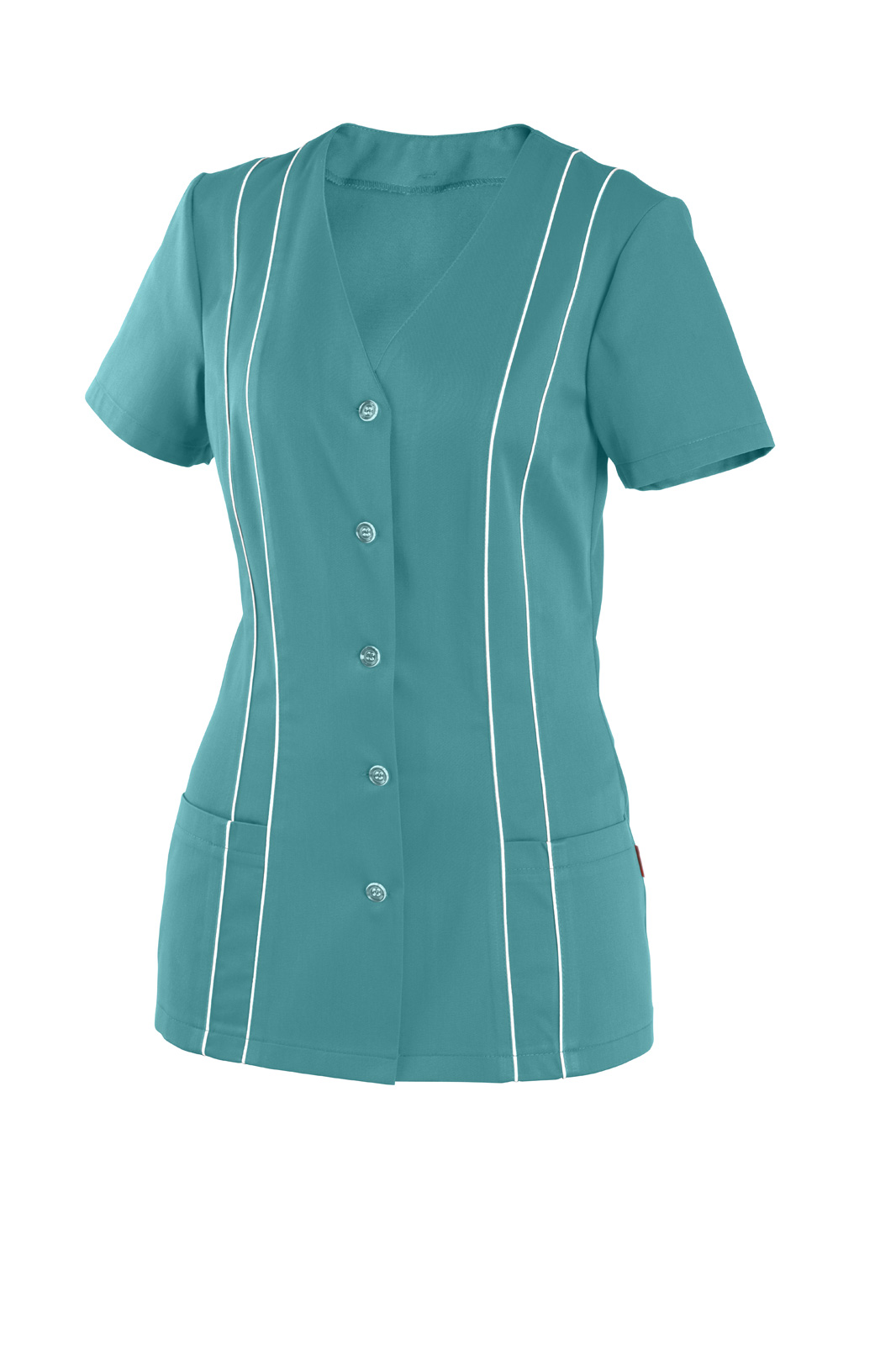 Princesového střihu, zapínání na knoflíky, výstřih do V. Krátký rukáv a na předním díle dvě našité kapsy. V prostřihu obou dílů vložený pruh s všitou dutinkou.