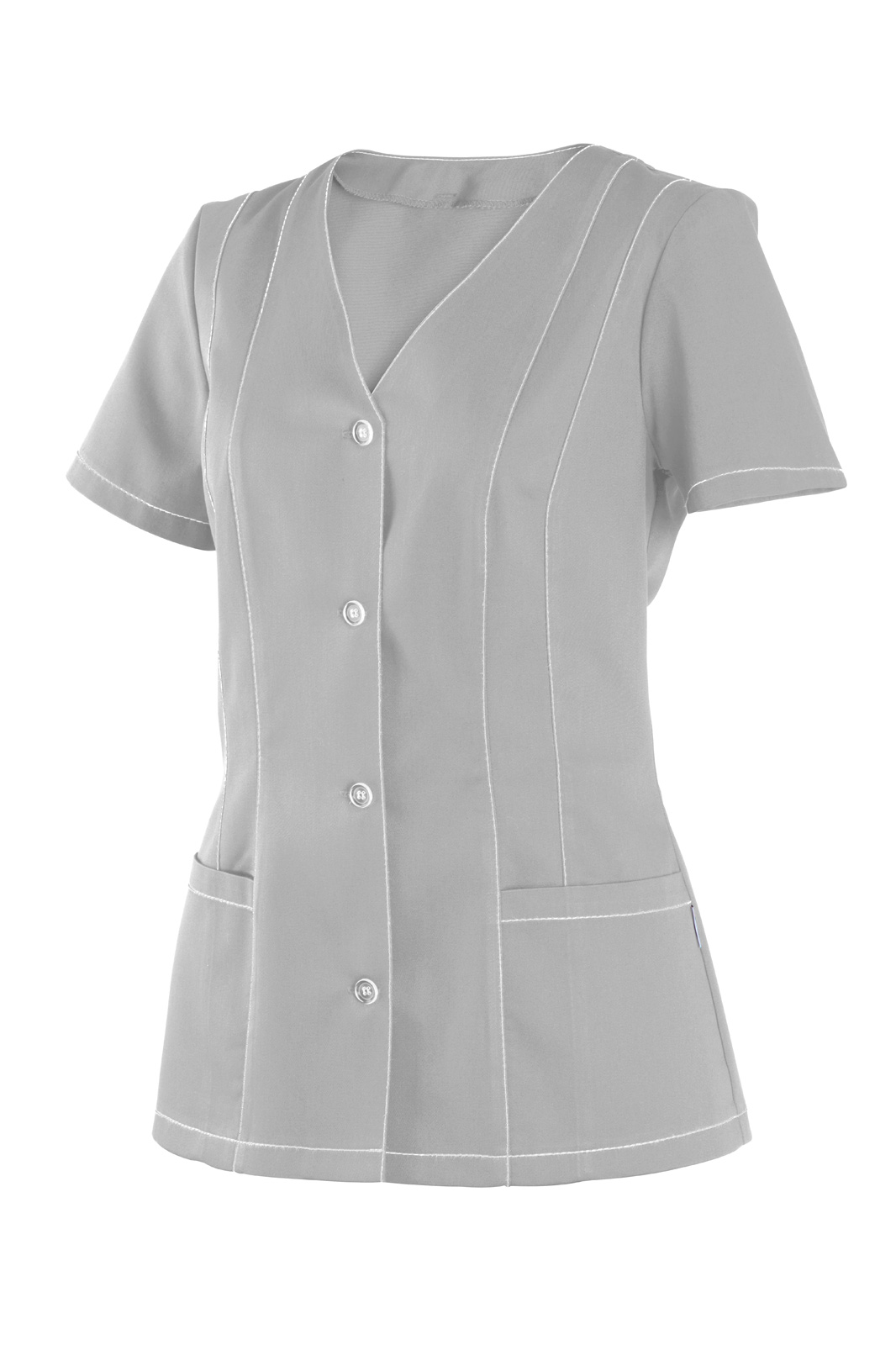 Princesového střihu, zapínání na knoflíky a výstřih do V. Krátký rukáv a na předním díle dvě našité kapsy. Štepování.