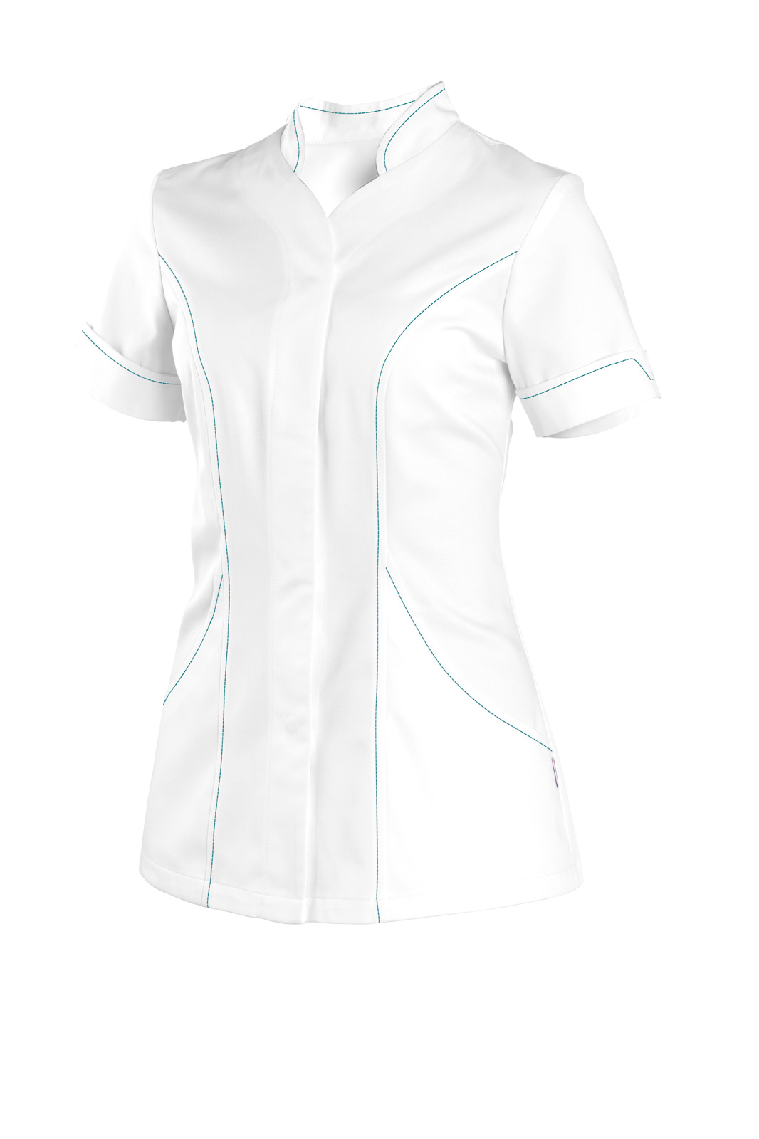 Princesového střihu, zapínání kryté na druky. Tvarovaný výstřih se stojáčkem a krátký rukáv s tvarovanou légou. Na předním díle dvě všité kapsy. Barevné štepování.