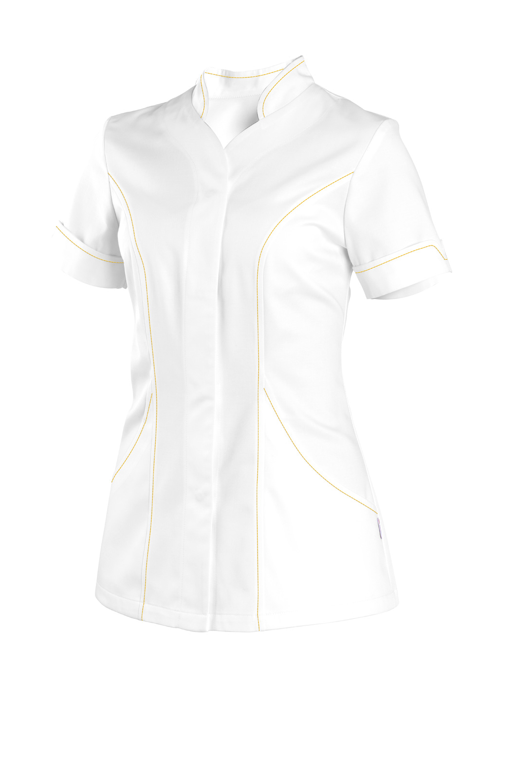 Princesového střihu, zapínání kryté na druky. Tvarovaný výstřih se stojáčkem a krátký rukáv s tvarovanou légou. Na předním díle dvě všité kapsy. Barevné štepování.