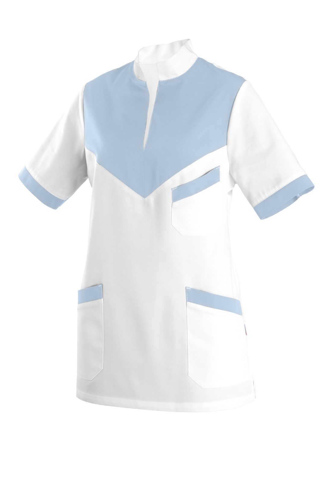 Bez zapínání volného střihu s krátkým rukávem s barevným lemováním. Na předním díle barevné sedlo, stojáček a tři našité kapsy s barevným, šikmým lemováním.