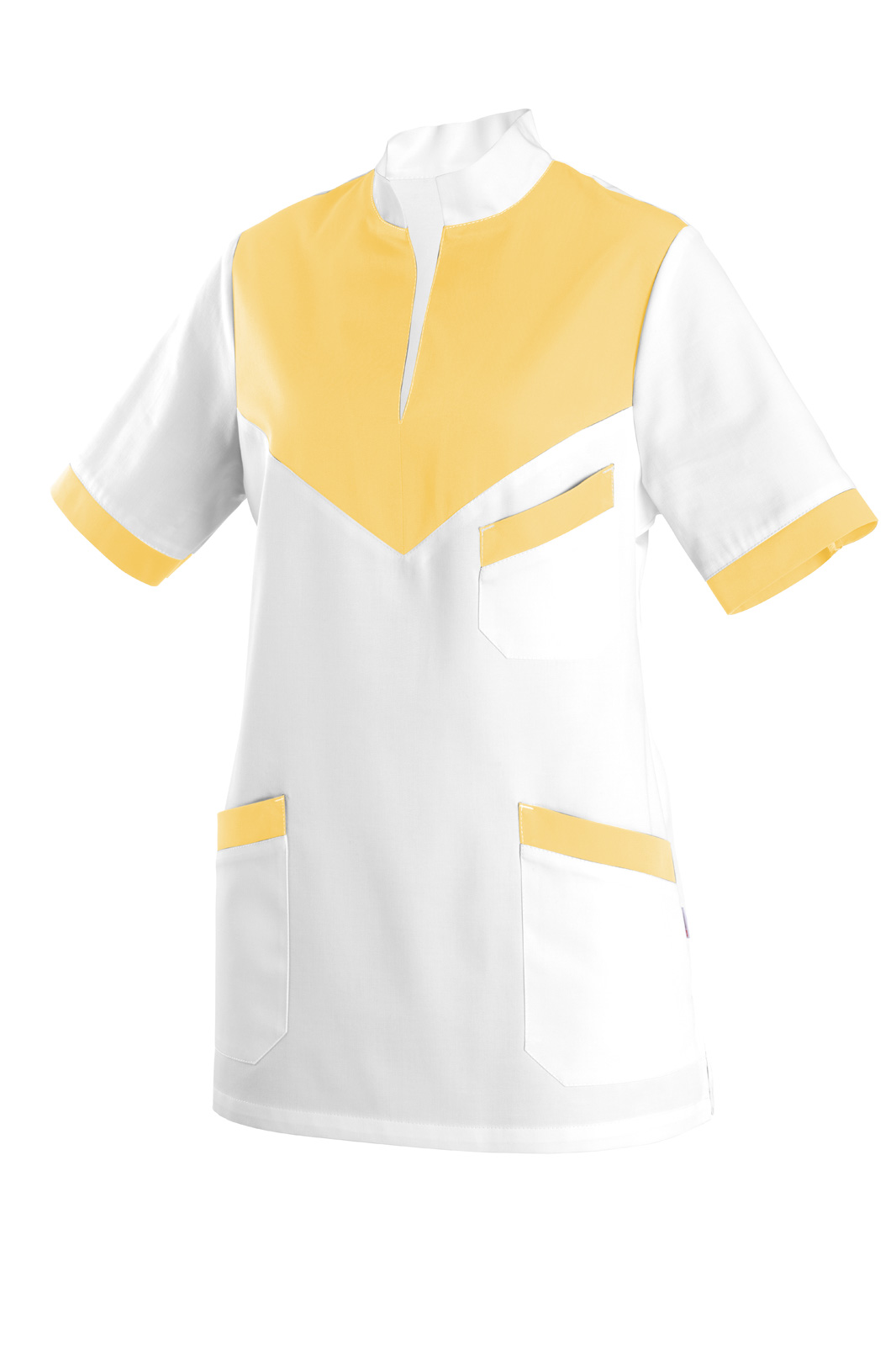 Bez zapínání volného střihu s krátkým rukávem s barevným lemováním. Na předním díle barevné sedlo, stojáček a tři našité kapsy s barevným, šikmým lemováním.