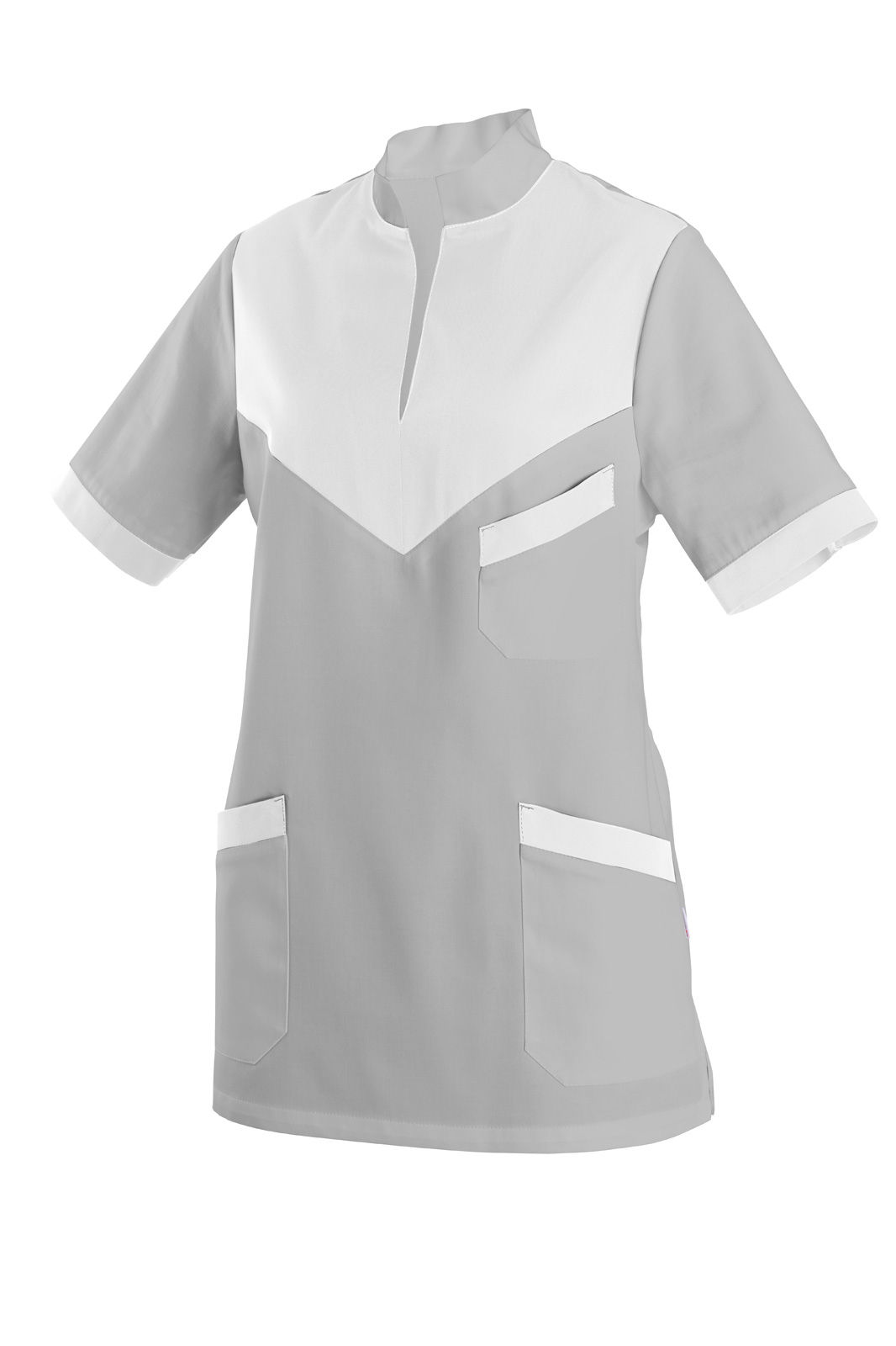 Bez zapínání volného střihu s krátkým rukávem s bílým lemováním. Na předním díle bílé sedlo, stojáček a tři našité kapsy s bílým, šikmým lemováním.
