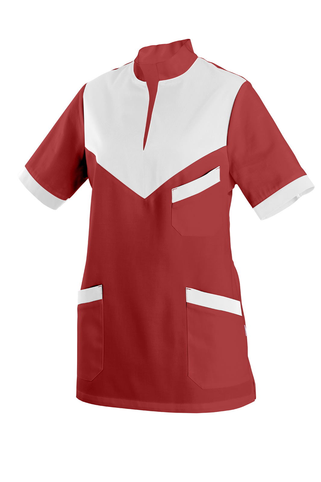 Bez zapínání volného střihu s krátkým rukávem s bílým lemováním. Na předním díle bílé sedlo, stojáček a tři našité kapsy s bílým, šikmým lemováním.