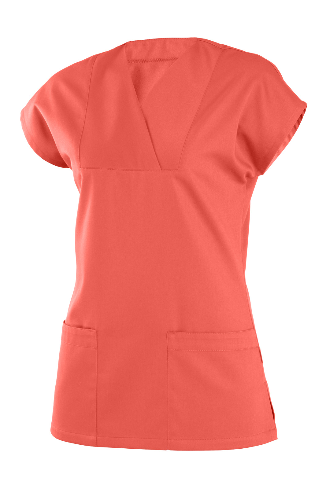 Volného střihu a kimono rukávem. Vsazený, přeložený výstřih do tvaru V a na předním díle dvě našité kapsy s lemem.