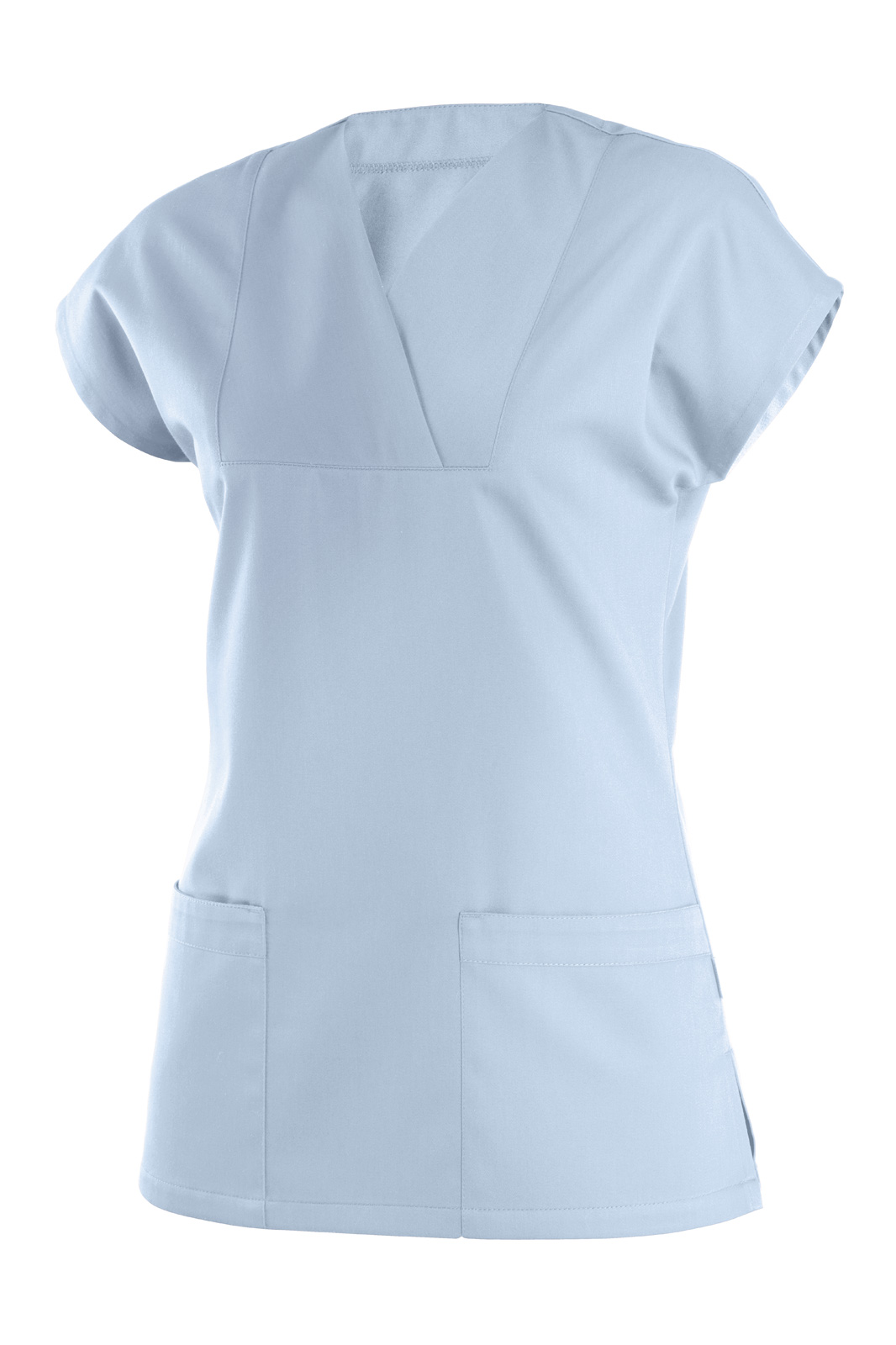 Volného střihu a kimono rukávem. Vsazený, přeložený výstřih do tvaru V a na předním díle dvě našité kapsy s lemem.