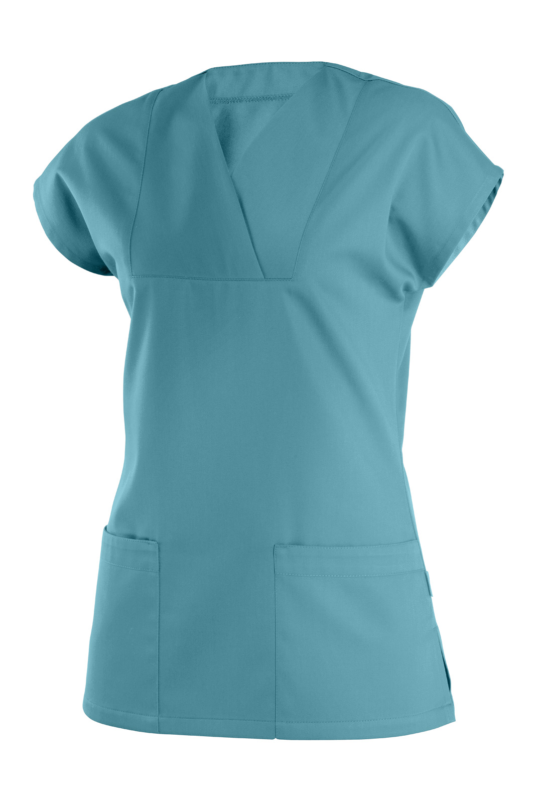 Volného střihu a kimono rukávem. Vsazený, přeložený výstřih do tvaru V a na předním díle dvě našité kapsy s lemem.