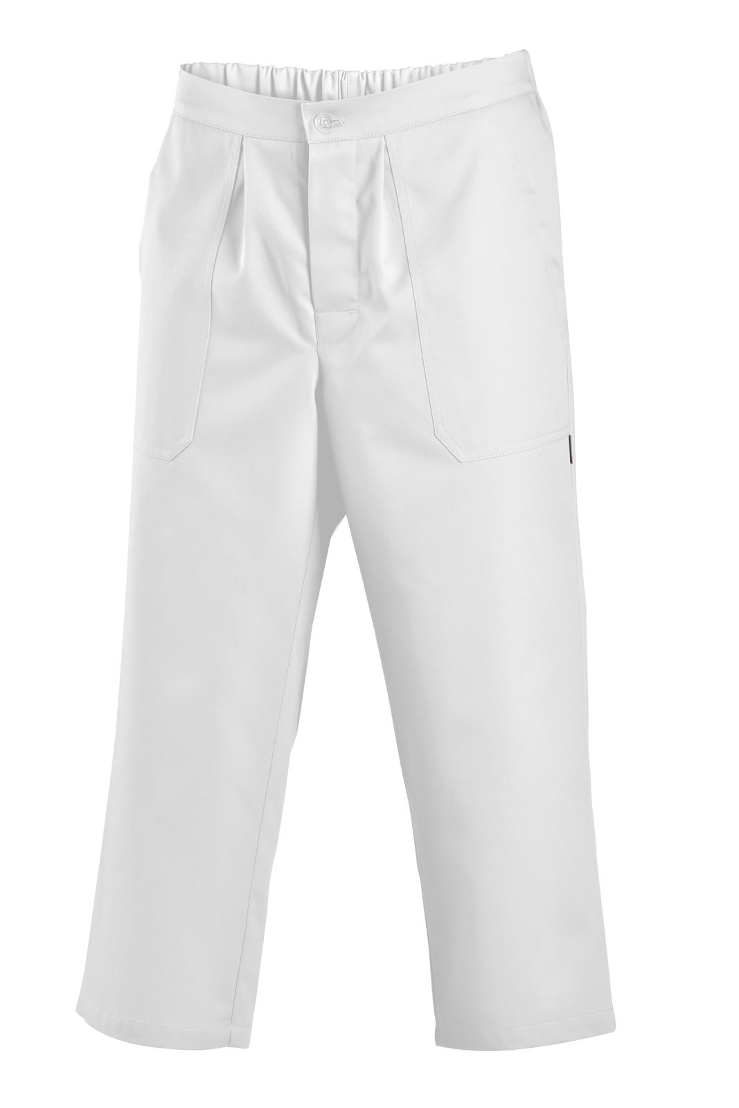 V zadním pásku guma, zapínání na knoflíky a dvě našité kapsy. Z pásku ve předu vypuštěny dva sklady.