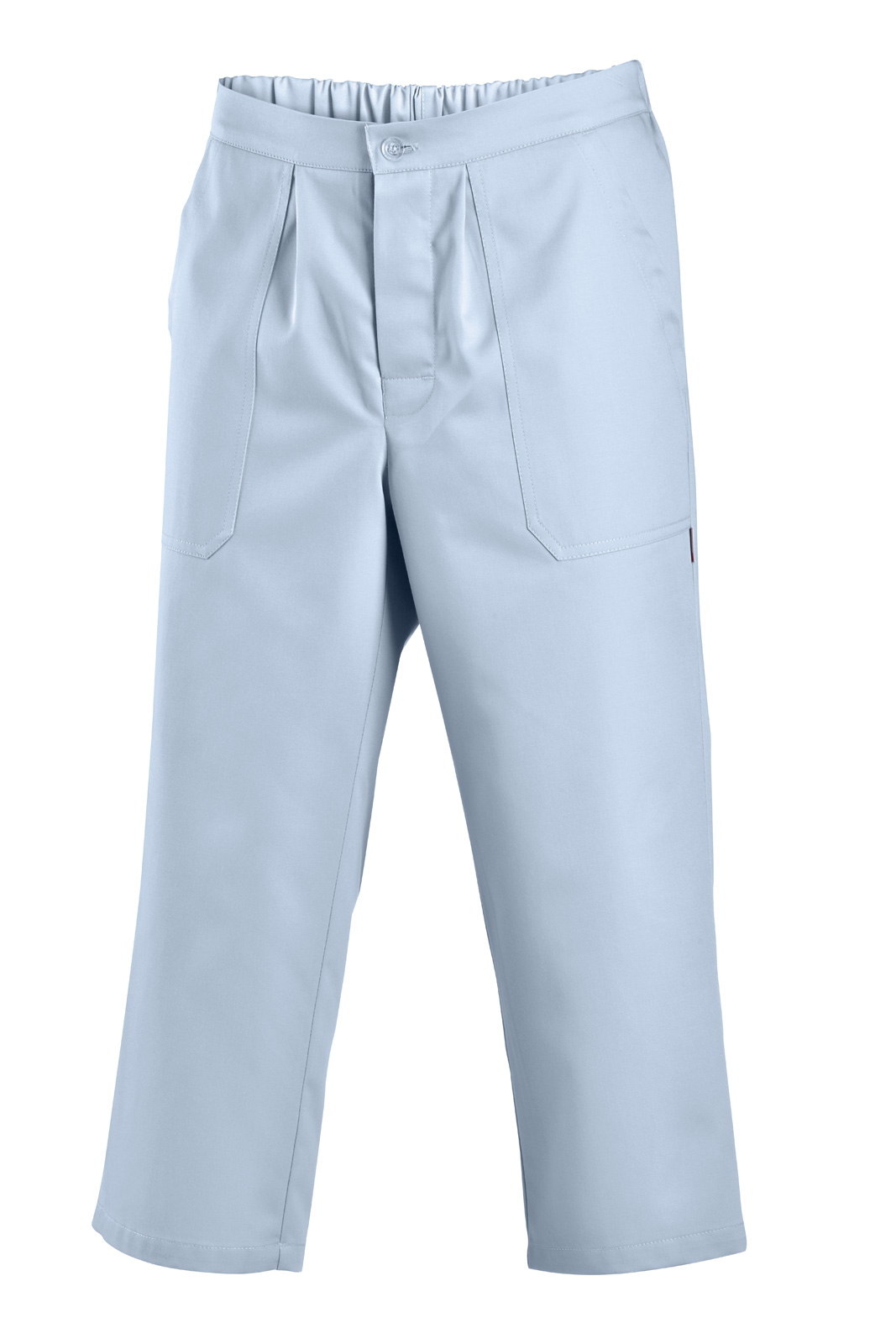 V zadním pásku guma, zapínání na knoflíky a dvě našité kapsy. Z pásku ve předu vypuštěny dva sklady.