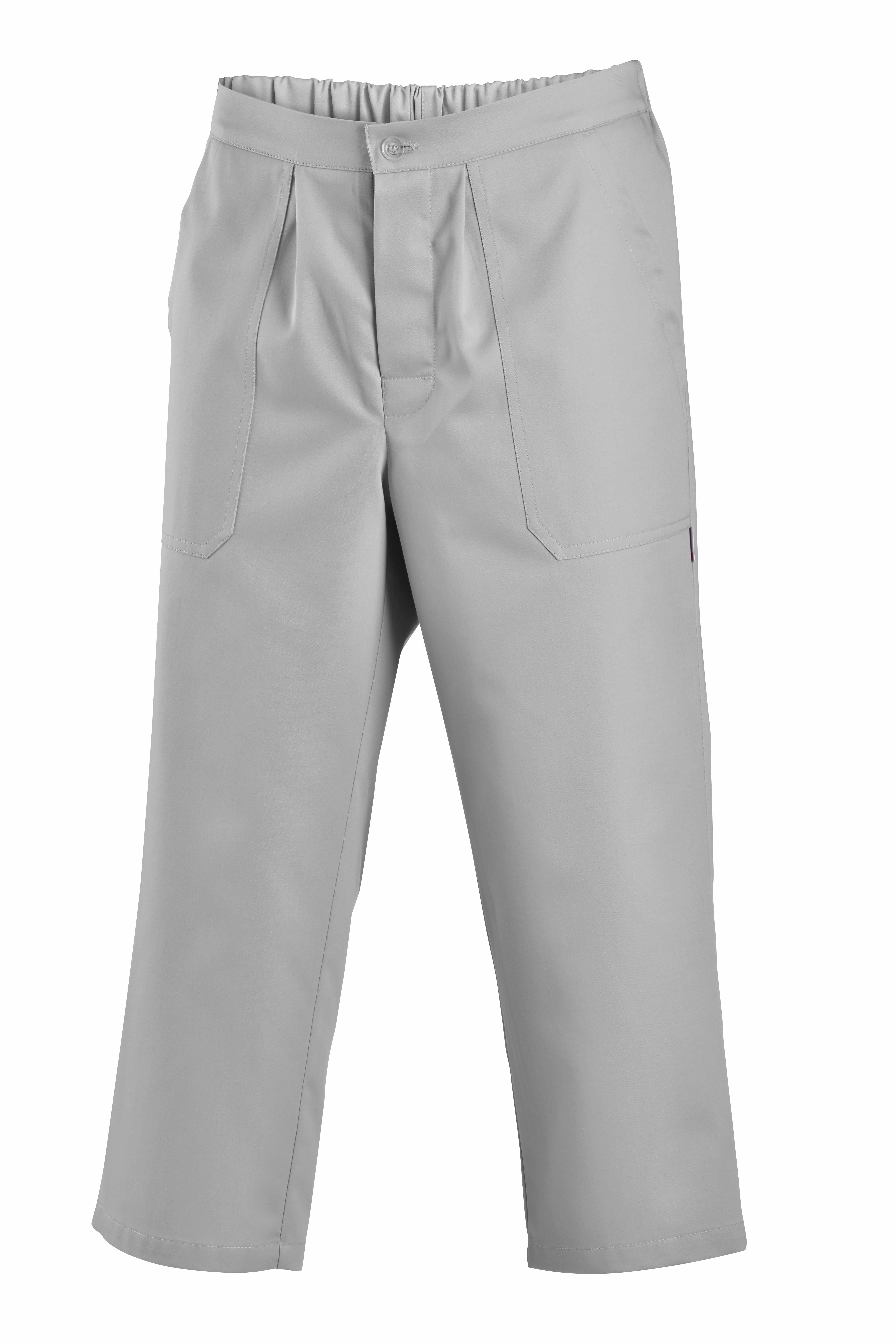 V zadním pásku guma, zapínání na knoflíky a dvě našité kapsy. Z pásku ve předu vypuštěny dva sklady.