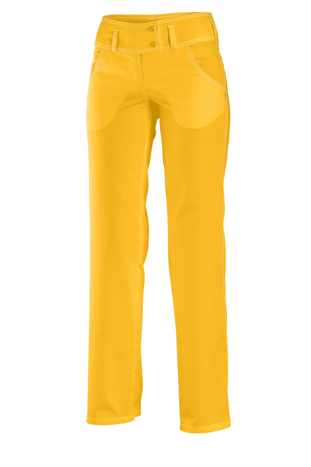 Široký, snížený pas, dvě přední a dvě zadní kapsy. Barevné štepování.