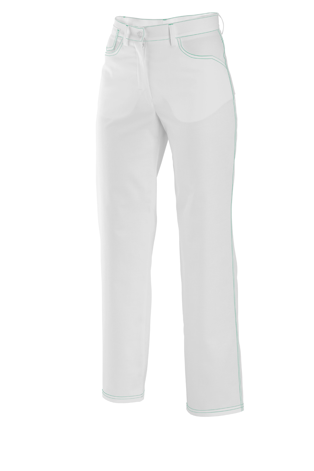 Riflového střihu. Dvě přední, dvě zadní kapsy a malá přední okrasná kapsička. Barevné štepování.