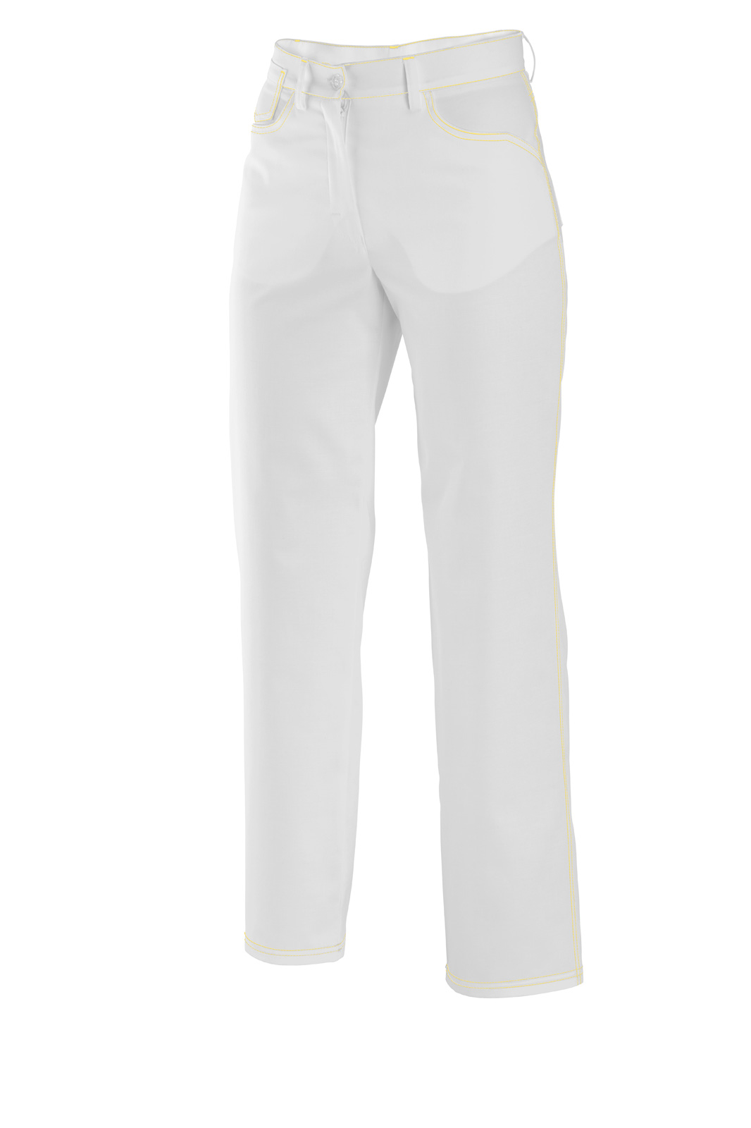 Riflového střihu. Dvě přední, dvě zadní kapsy a malá přední okrasná kapsička. Barevné štepování.