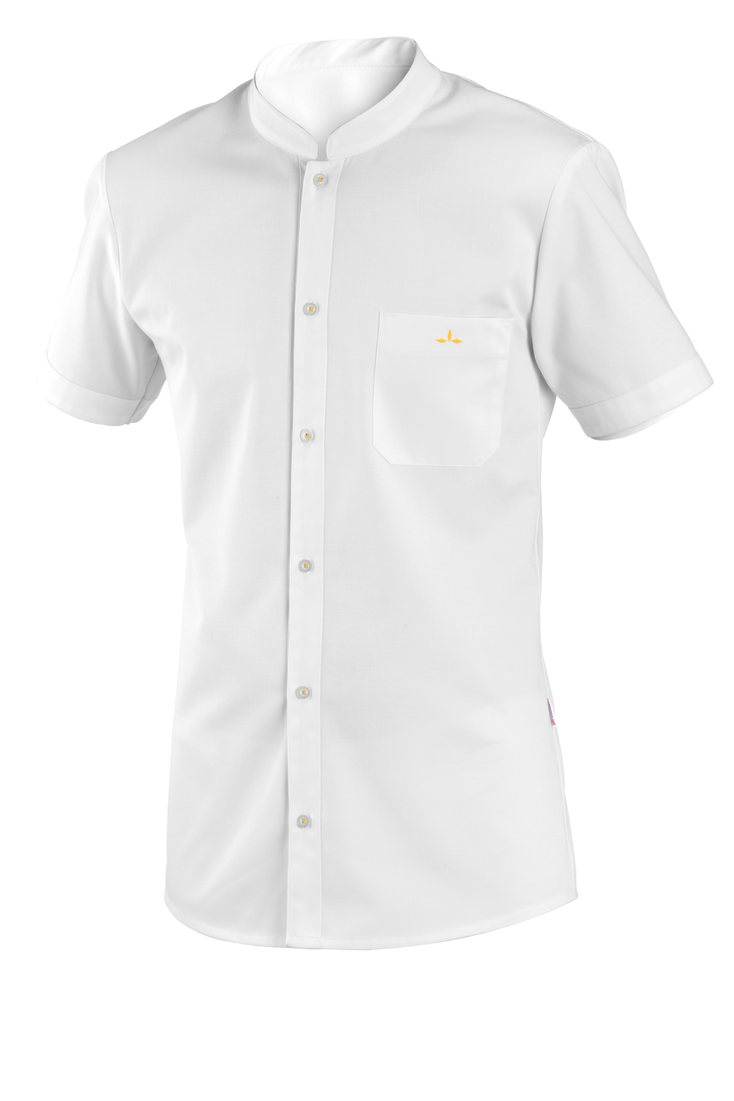 S krátkým rukávem, zakončeným lemem. Stojáček, náprsní kapsa s barevnou výšivkou, zadní díl se sedlem a délka košile do tvaru.