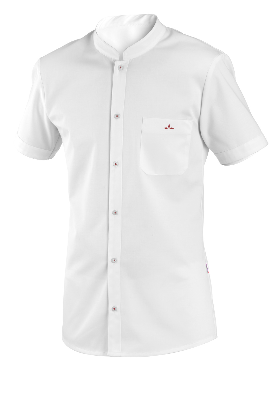 S krátkým rukávem, zakončeným lemem. Stojáček, náprsní kapsa s barevnou výšivkou, zadní díl se sedlem a délka košile do tvaru.