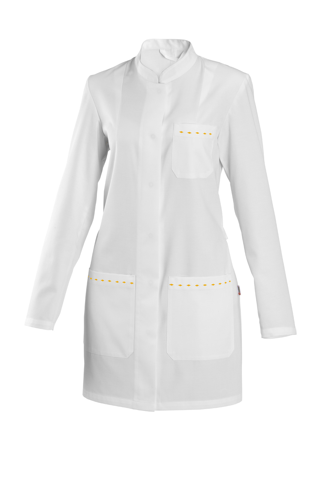 Se stojáčkem volného střihu, dlouhý rukáv, prsní ramenní záševky. Zapínání kryté na druky a na předním díle tři našité kapsy s barevnou výšivkou.
