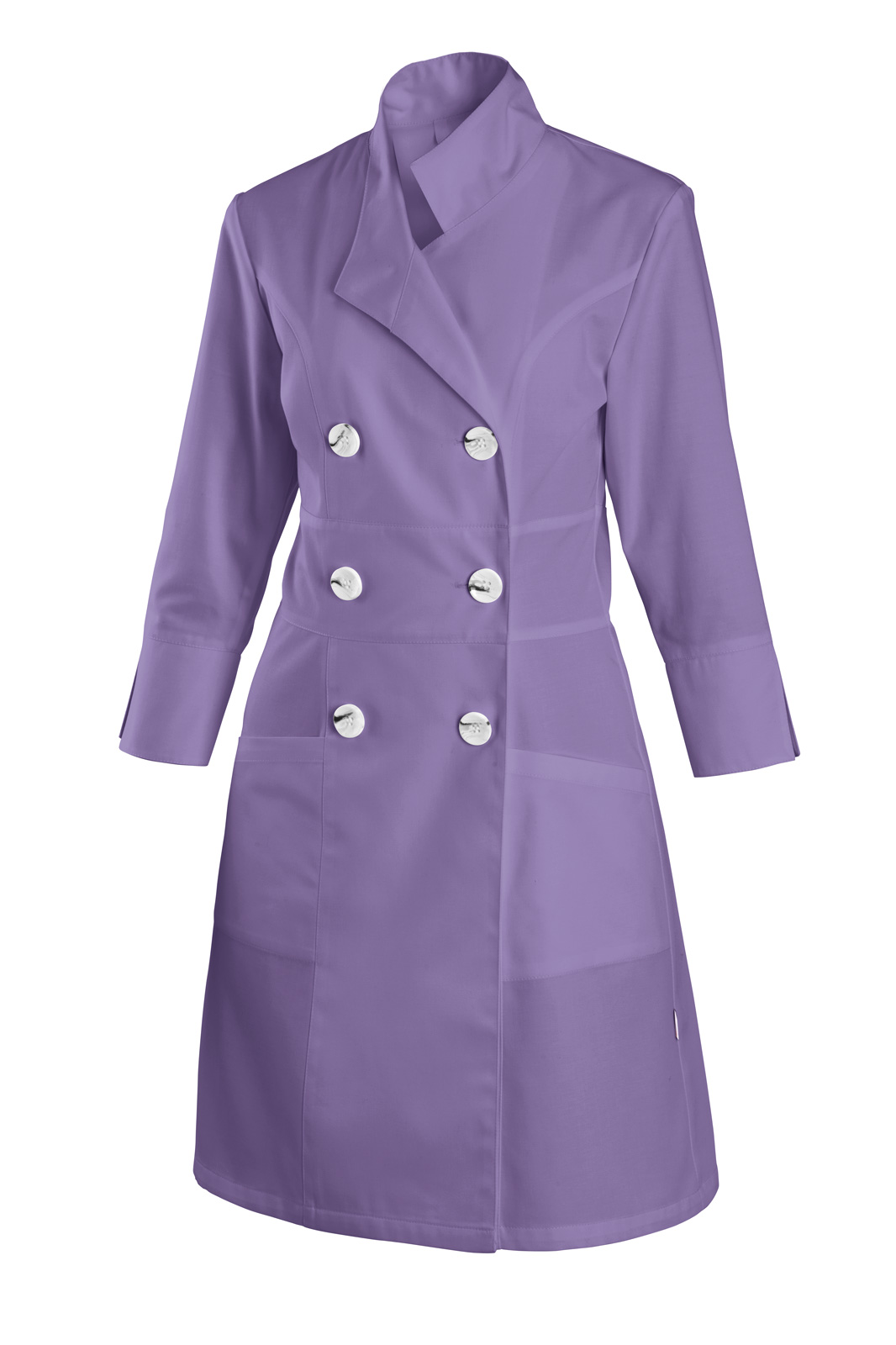 S klopou, princesového střihu, dělený širokým pasem, 3/4 rukávy. Na předním díle našité dvě spodní kapsy, dvouřadové zapínání na 6 knoflíků, jednobarevný.