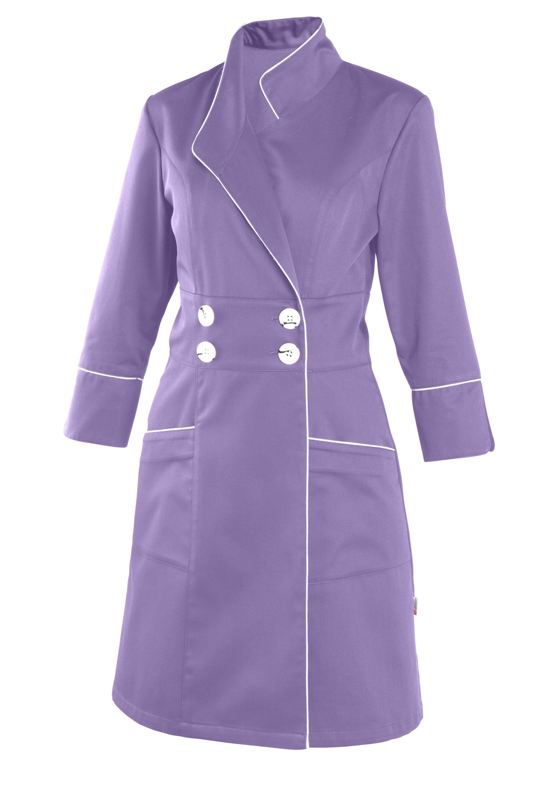 S klopou, princesového střihu, dělený širokým pasem, 3/4 rukávy. Na předním díle našité dvě spodní kapsy, dvouřadové zapínání na 4 knoflíky, lemovaný bílou dutinkou.