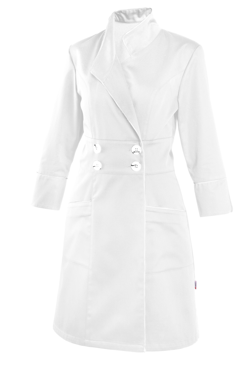 S klopou, princesové+L92:V92ho střihu, dělený širokým pasem, 3/4 rukávy. Na předním díle našité dvě spodní kapsy, dvouřadové zapínání na 4 knoflíky, lemovaný bílou dutinkou.