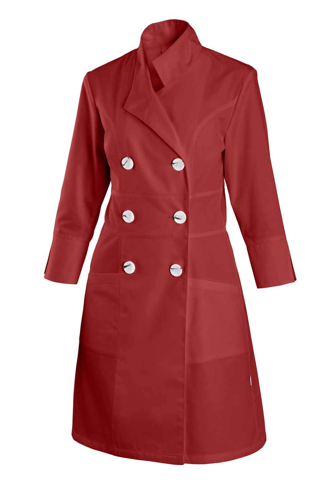 S klopou, princesového střihu, dělený širokým pasem, 3/4 rukávy. Na předním díle našité dvě spodní kapsy, dvouřadové zapínání na 6 knoflíků, jednobarevný.