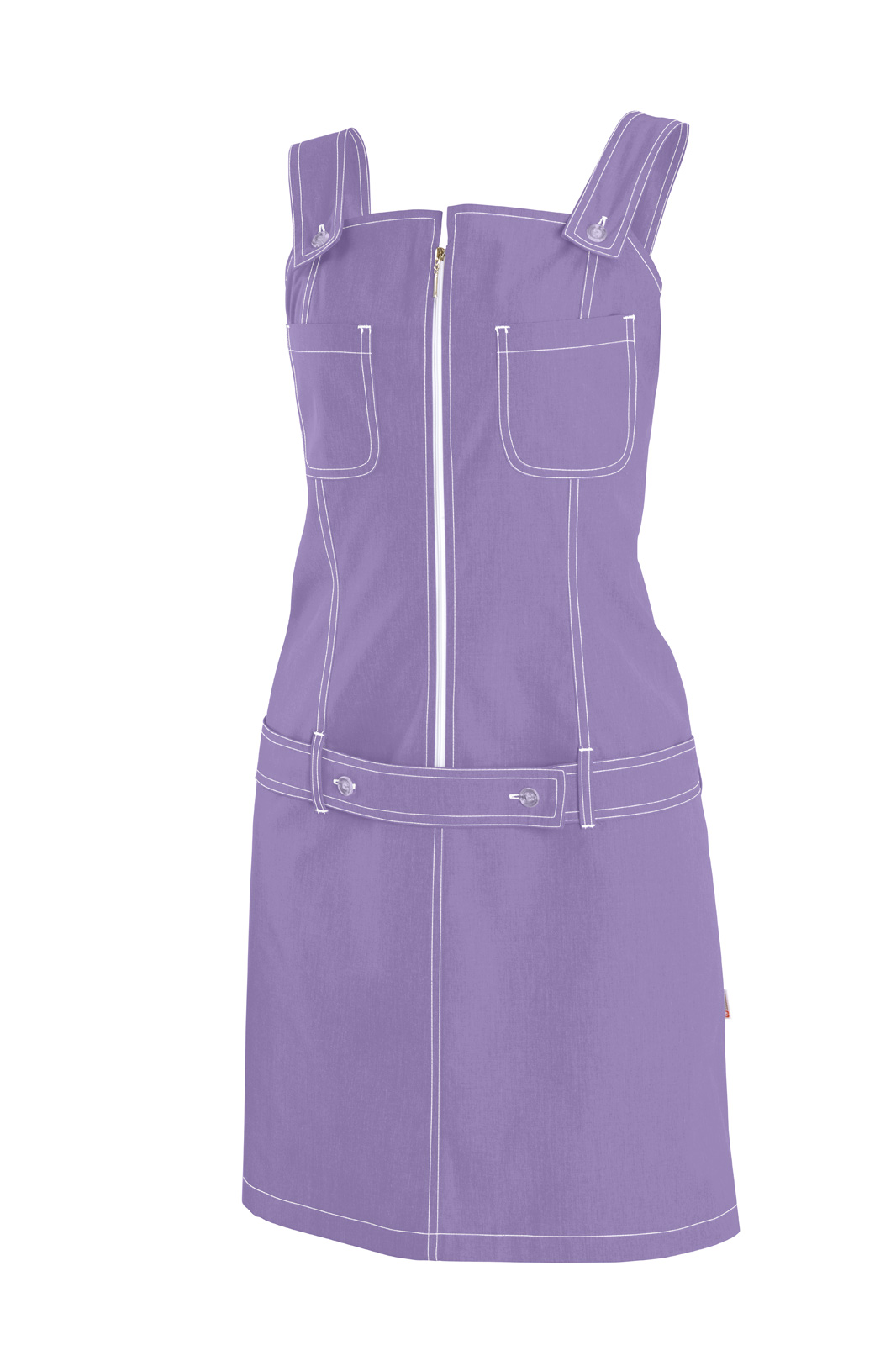 Princesového střihu, na předním díle zip, dvě náprsní kapsy a ve sníženém pase pásek. Na zadním díle rozparek. Bílé štepování a zip.
