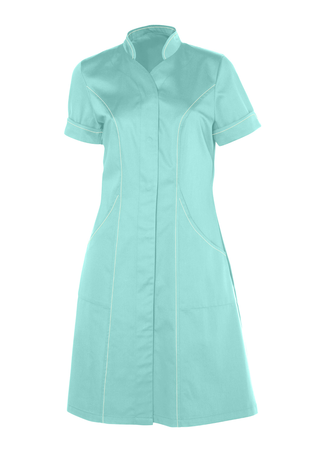 Princesového střihu, zapínání kryté na druky. Tvarovaný výstřih se stojáčkem a krátký rukáv s tvarovanou légou. Na předním díle dvě všité kapsy. Barevné štepování.