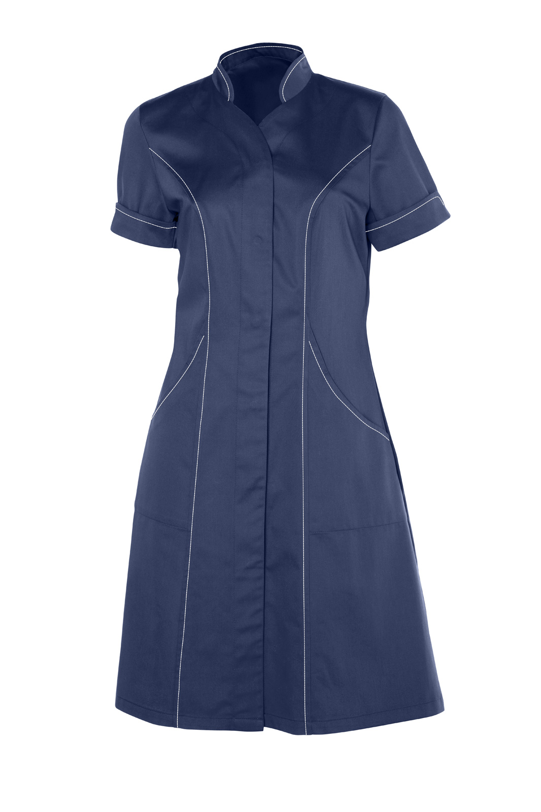 Princesového střihu, zapínání kryté na druky. Tvarovaný výstřih se stojáčkem a krátký rukáv s tvarovanou légou. Na předním díle dvě všité kapsy. Barevné štepování.