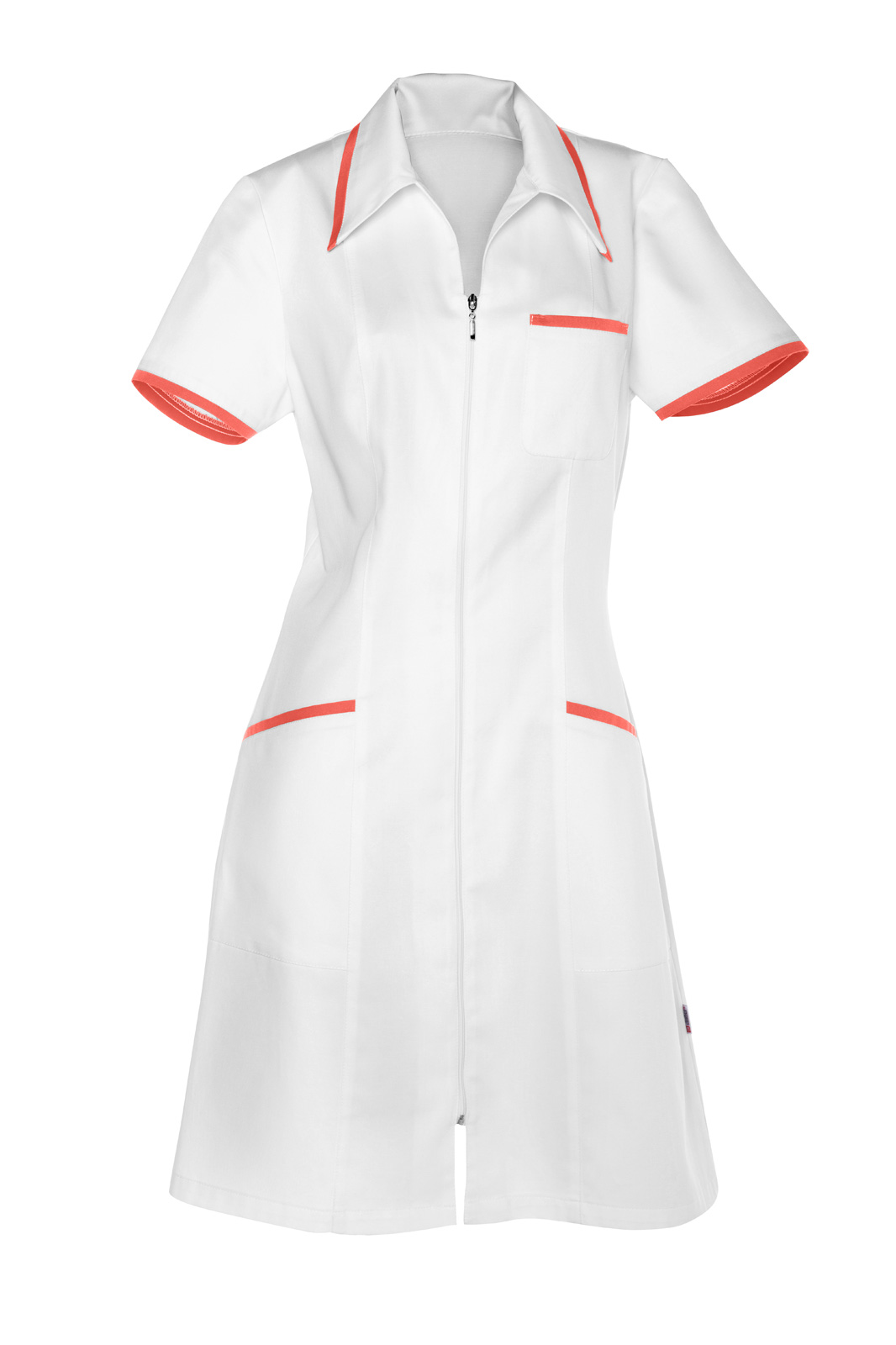 Princesového střihu, celopropínací na zip a krátkým rukávem zakončeným barevným lemem. Výstřih s lemovaným límečkem a na předním díle tři našité, lemované kapsy.