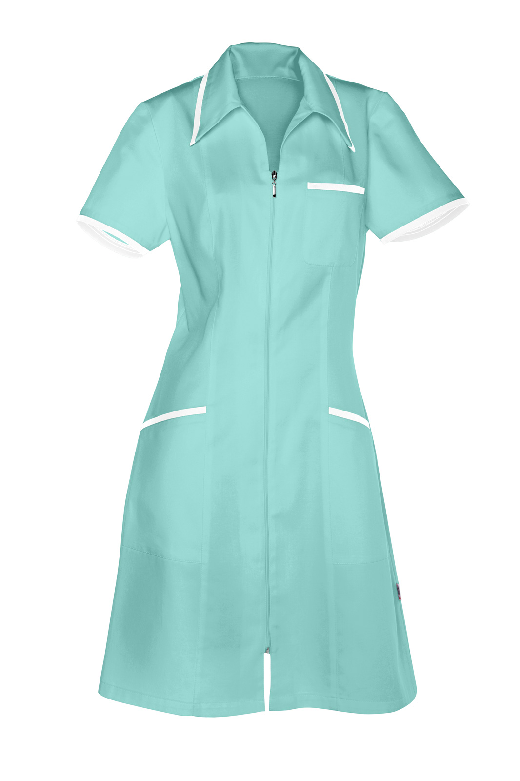 Princesového střihu, celopropínací na zip a krátkým rukávem zakončeným barevným lemem. Výstřih s lemovaným límečkem a na předním díle tři našité, lemované kapsy.