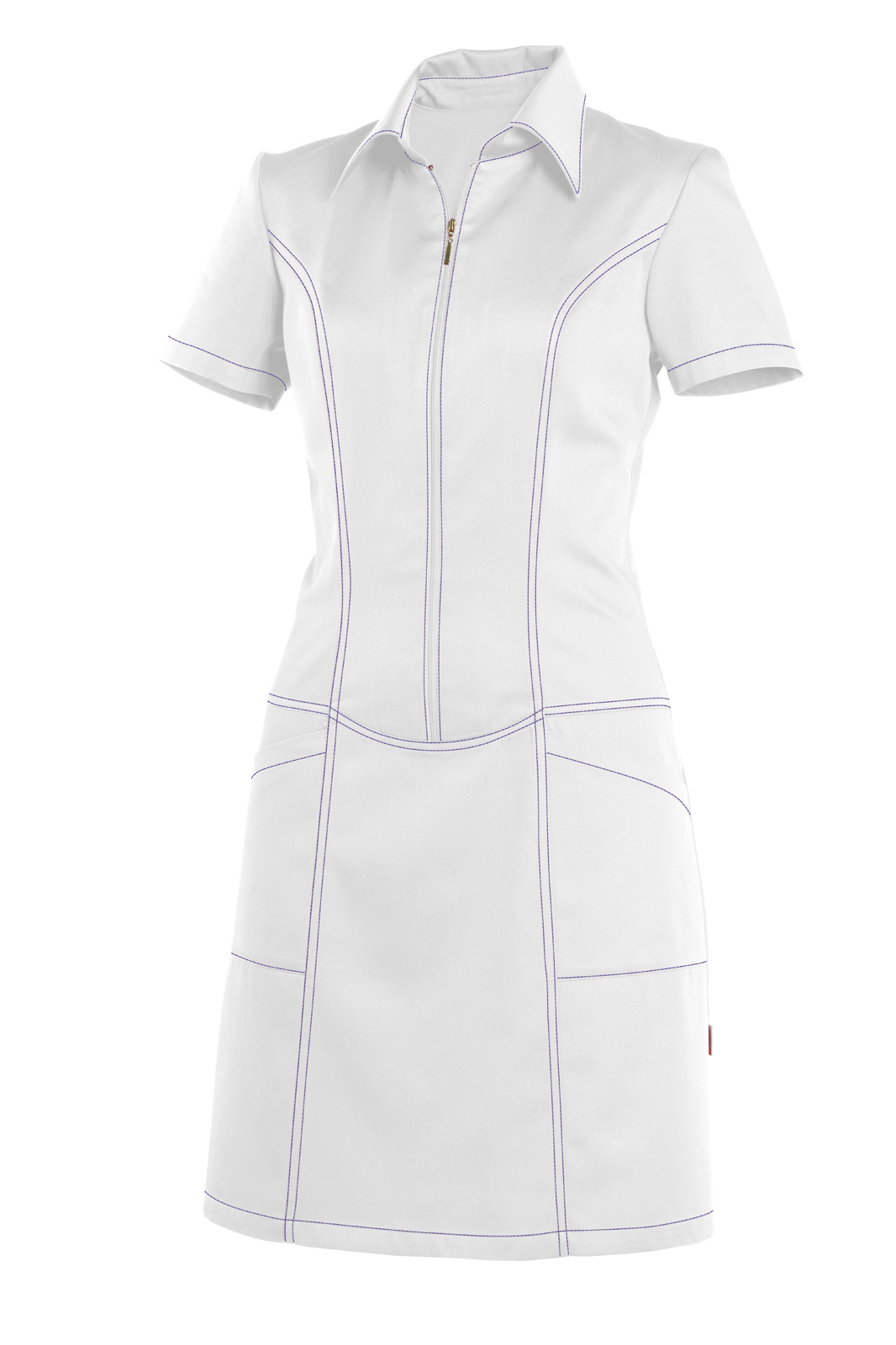 Princesového střihu, v průkrčníku všitý límcem se stojáčkem a krátký rukáv. Přední díl je členěný zipem k bokům, dvě našité kapsy. Barevné štepování.