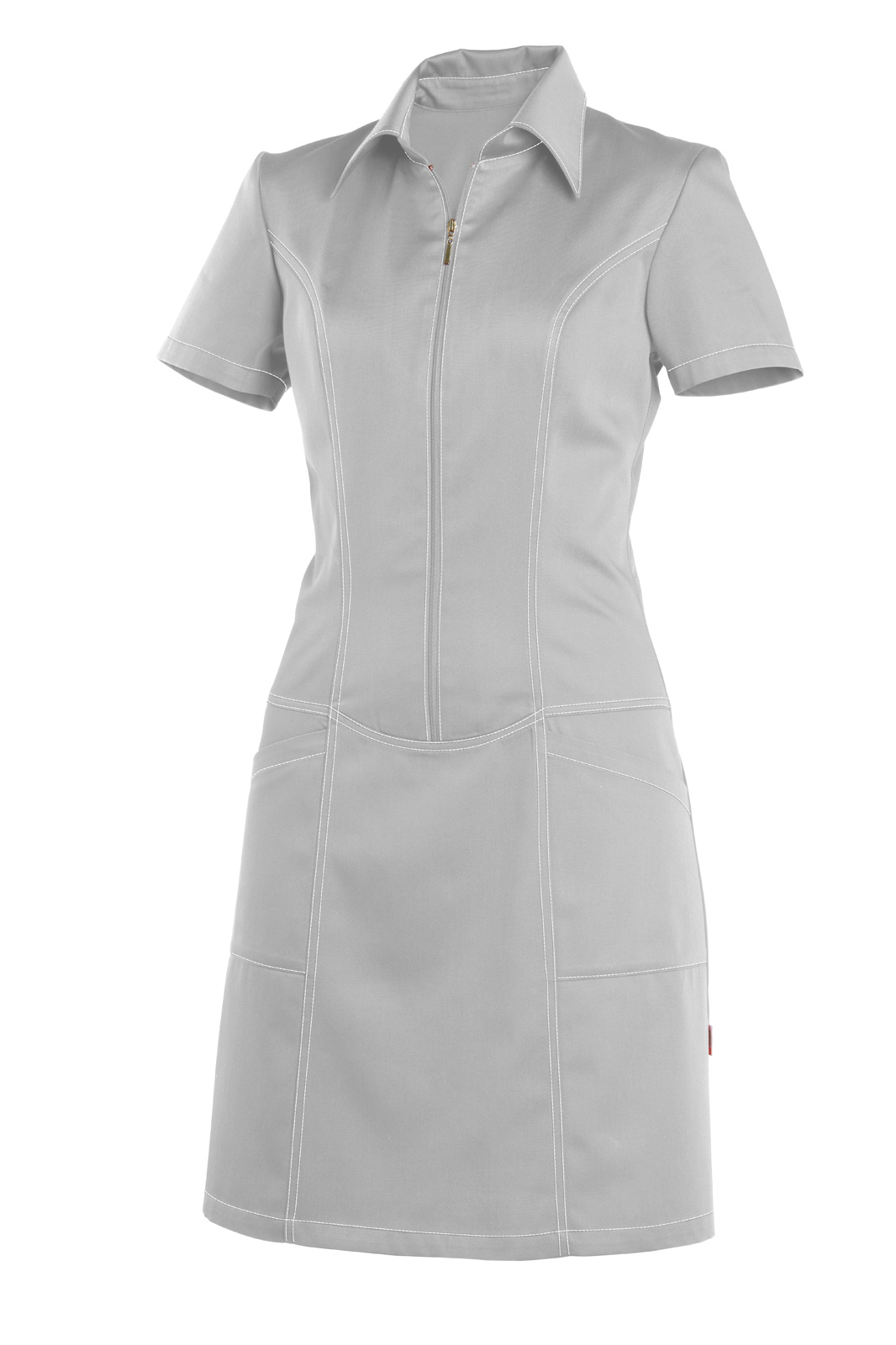 Princesového střihu, v průkrčníku všitý límcem se stojáčkem a krátký rukáv. Přední díl je členěný zipem k bokům, dvě našité kapsy. Bílé štepování a zip.