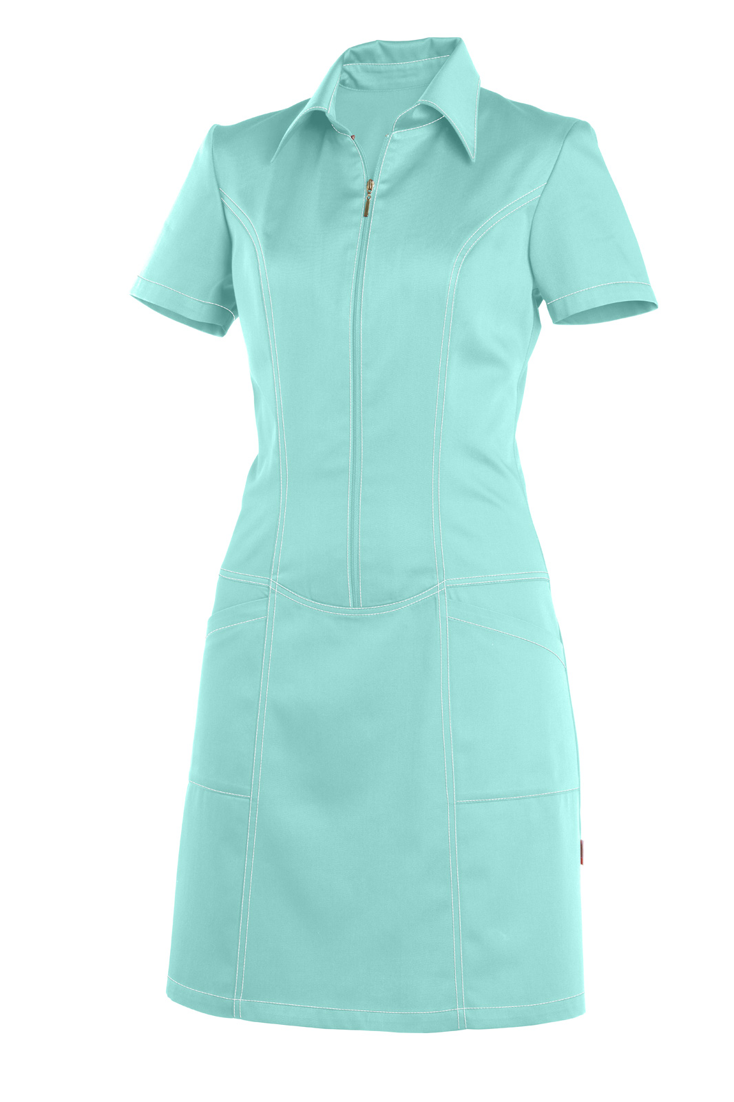 Princesového střihu, v průkrčníku všitý límcem se stojáčkem a krátký rukáv. Přední díl je členěný zipem k bokům, dvě našité kapsy. Bílé štepování a zip.