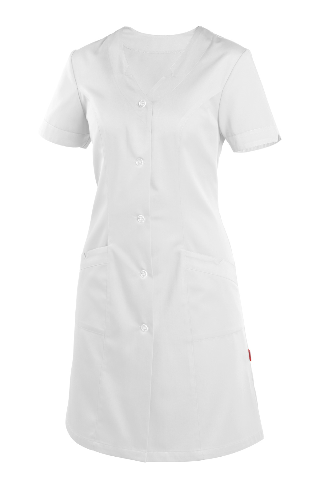 Princesového střihu, celopropínací na knoflíky a krátký rukáv s lemováním. Výstřih do V a na předním díle dvě našité kapsy. Lem rukávu, kapes a výstřih je ozdoben prostřihem do tvaru V.